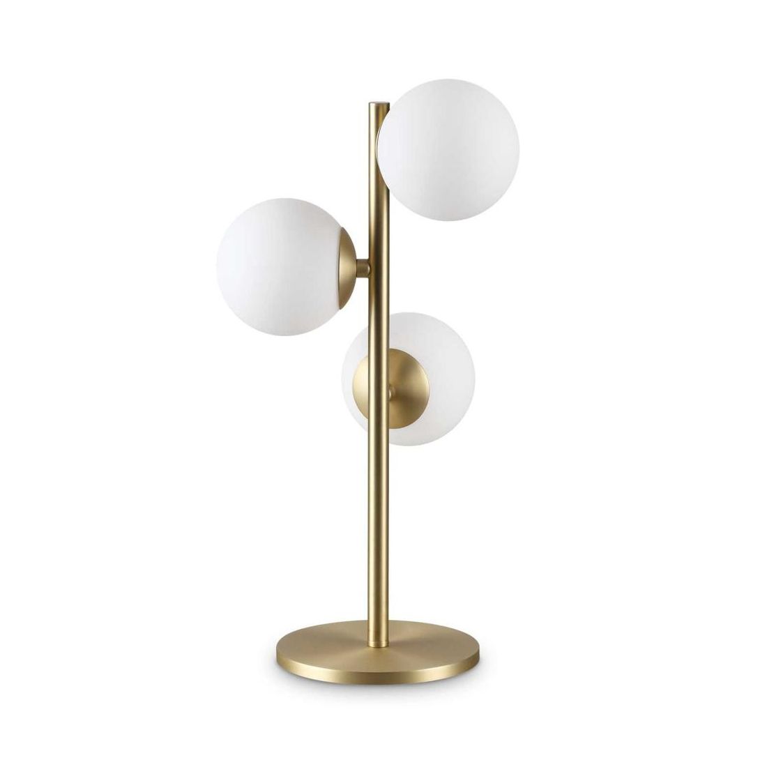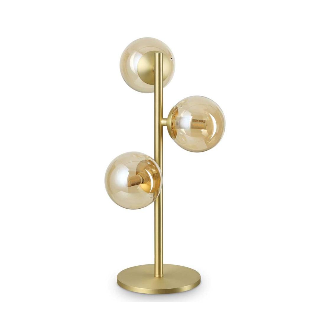 Lampada da tavolo dal design moderno, con una struttura lineare, con uno stile vistoso e raffinato, che si presenta con una montatura in metallo con finitura Nera oppure Ottone satinato con ancorati 3 diffusori a sfera realizzati in vetro soffiato.