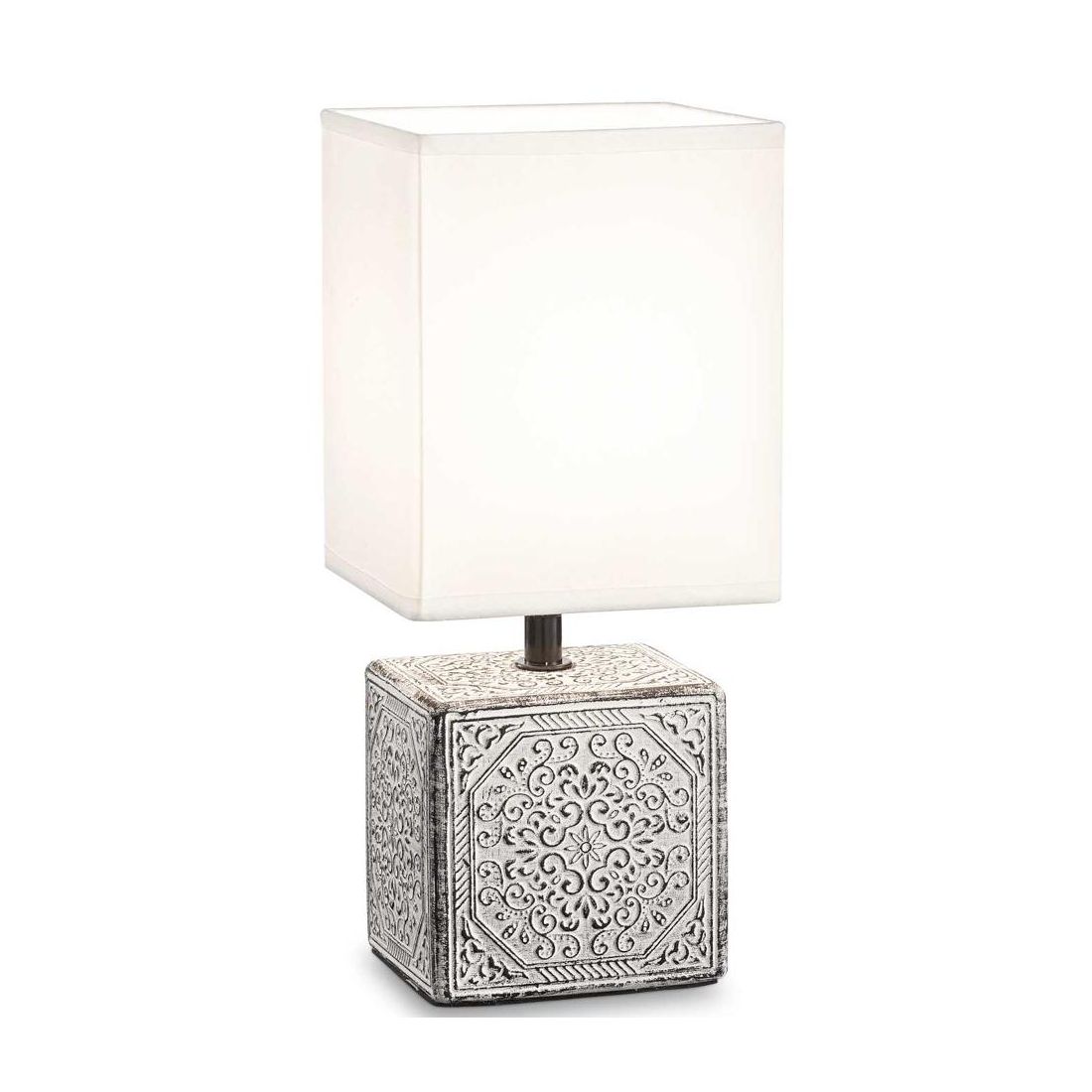 Lampada da tavolo composta da una base in ceramica, di forma quadrata, con decori etnici in rilievo e dal paralume in pvc rivestito in tessuto bianco, sempre di forma quadrata; il cavo elettrico è prodotto in pvc con interruttore integrato.