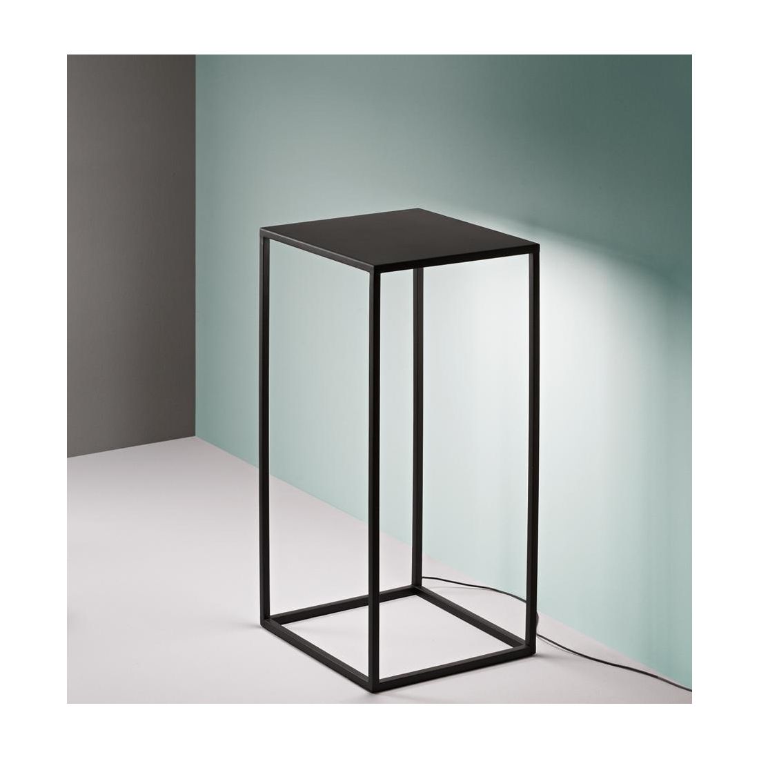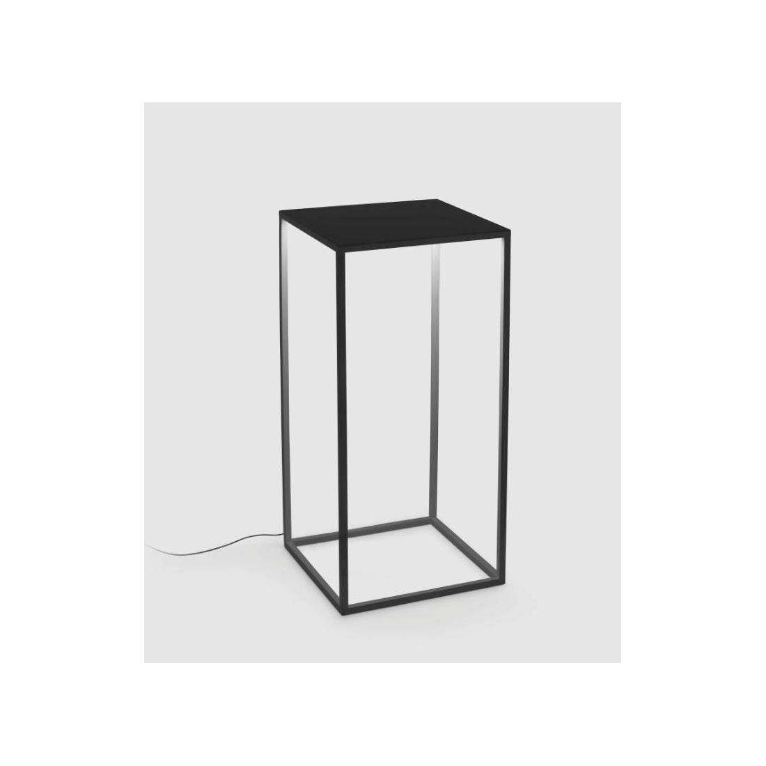 Lampada da terra, ideata per ambienti esterni, dal design minimalista, che si presenta con una struttura interamente realizzata in alluminio verniciato a polvere nel colore Nero con il diffusore in policarbonato opalino studiato per proiettare il fascio luminoso esclusivamente verso il basso, evitando l'abbagliamento e per diffondere la luce in modo omogeneo, creando un effetto soffuso e riposante.