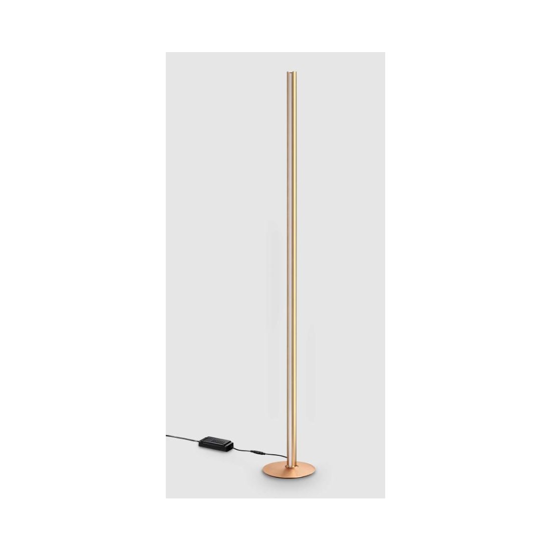 Lampada da terra, dal design moderno, caratterizzata da una silhouette tubolare slanciata, che si presenta con una struttura realizzata in alluminio con finitura rigata (disponibile nei colori Nero, Bianco, Arancione e Blu) oppure con finitura liscia satinata (Ottone, Rame, Grigio, Bronzo e Acciaio), che si distingue per la forma tubolare e le linee pulite; ideale per l'illuminazione di un salotto, di uno studio o di una camera da letto.
