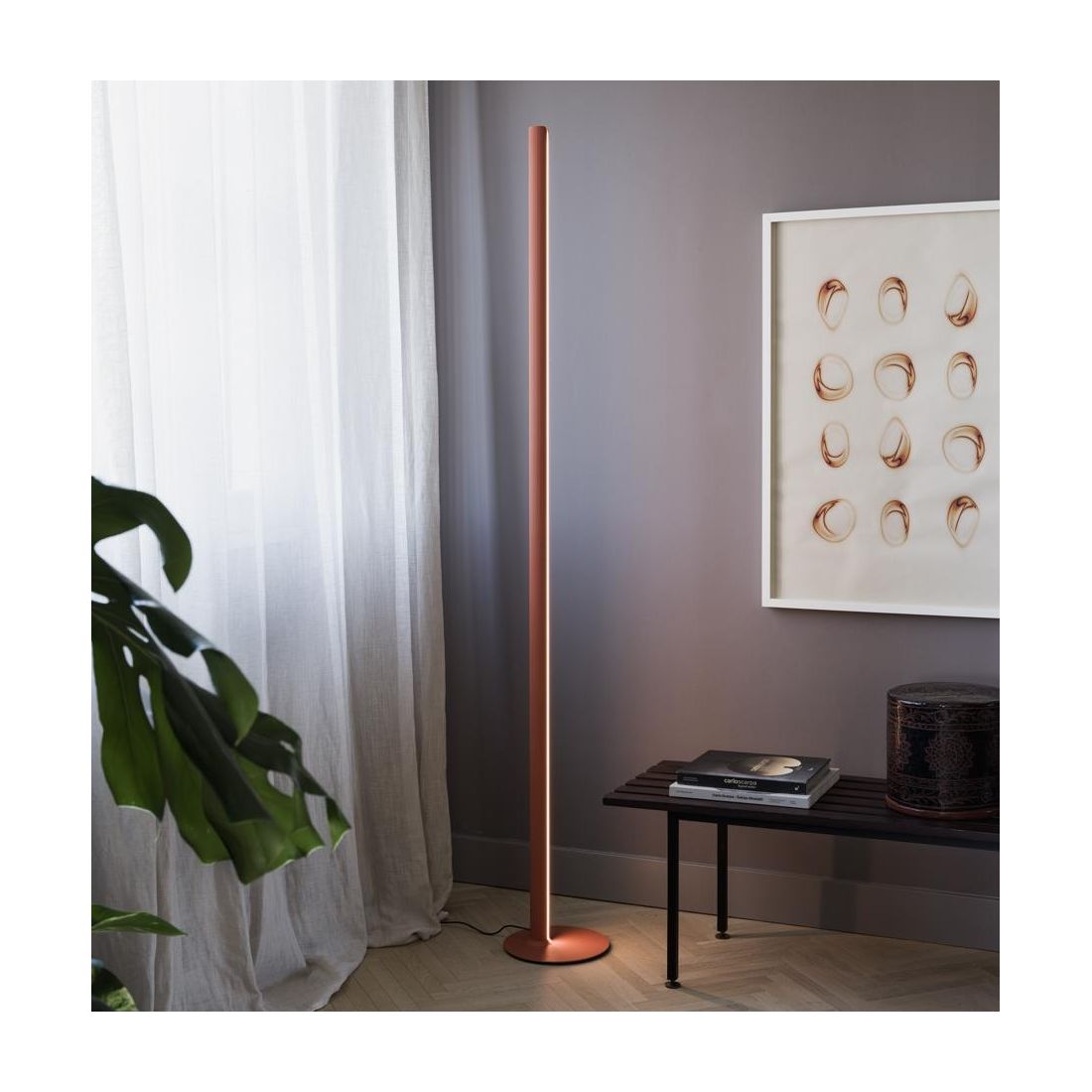 Questa lampada rappresenta l'evoluzione della classica piantana: una colonna di luce pura che scompare nello spazio quando spenta, per diventarne protagonista assoluta una volta accesa.