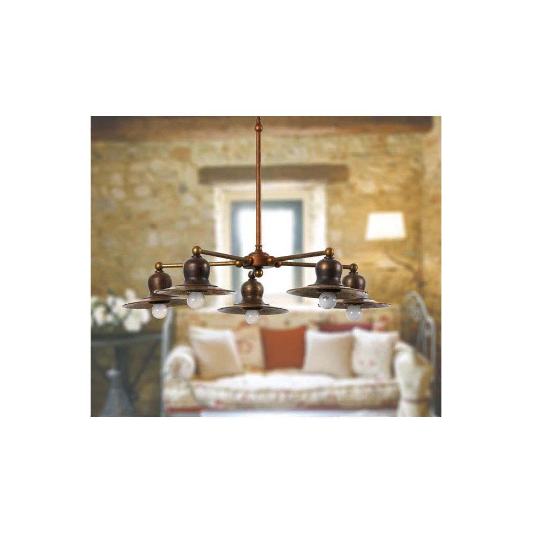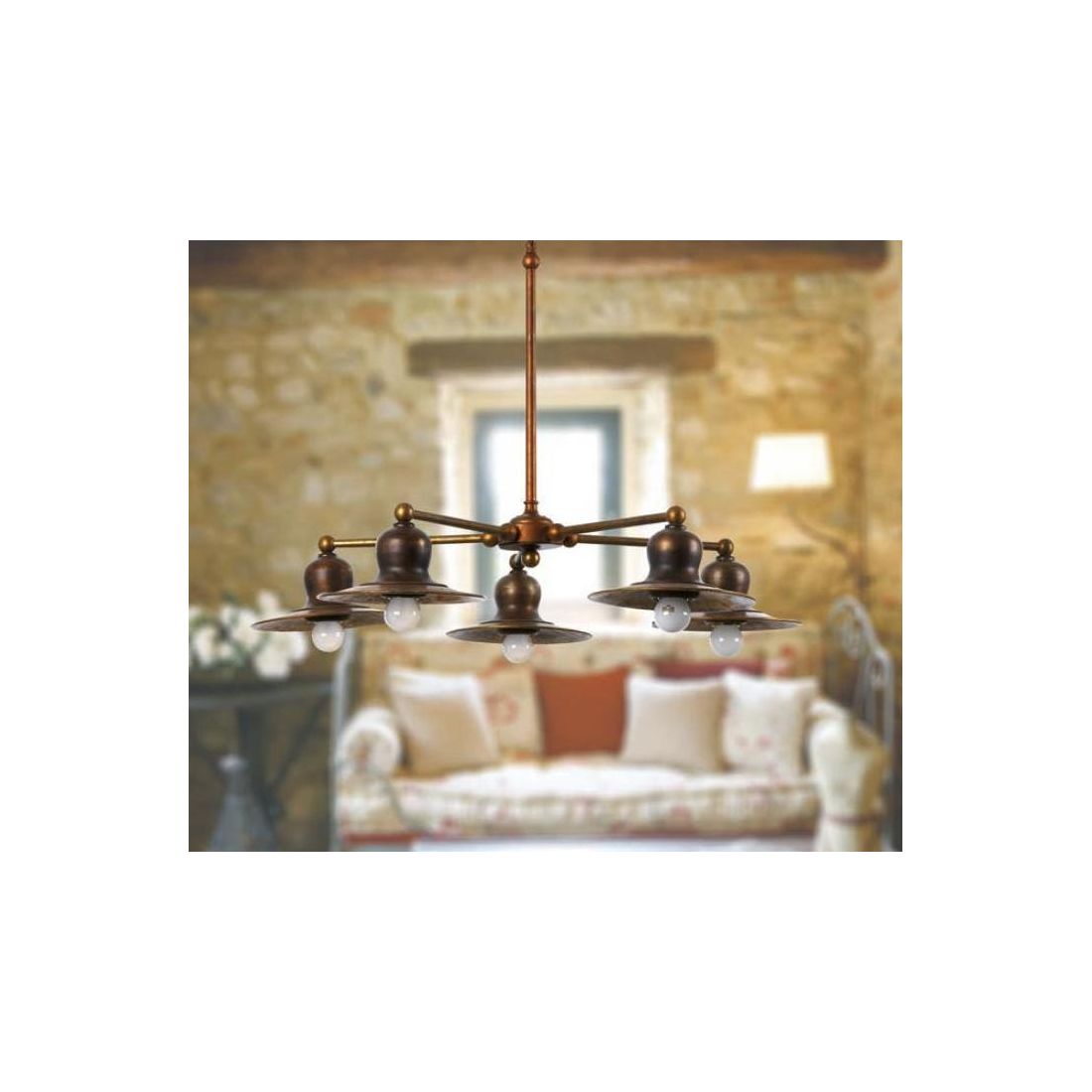 Lampadario con 5 luci in stile rustico con una struttura circolare, stilizzata, interamente realizzata in Ottone invecchiato con piatti del diametro di cm 20 ciascuno; un prodotto Made in Italy, della ditta IMAS Firenze, perfetto per illuminare ambienti rustici o classici, da installare in particolare nel soggiorno, in cucina o in taverna.