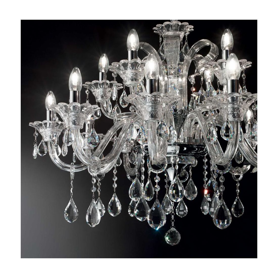 Lampadario a sospensione, in stile classico, che si presenta con una montatura in metallo cromato, con bracci in vetro soffiato trasparente oppure con interno di colore grigio (a vostra scelta). Il lampadario viene arricchito con pendagli ed elementi decorativi in vetro trasparente e cristallo molato e dal copricatena in velluto.