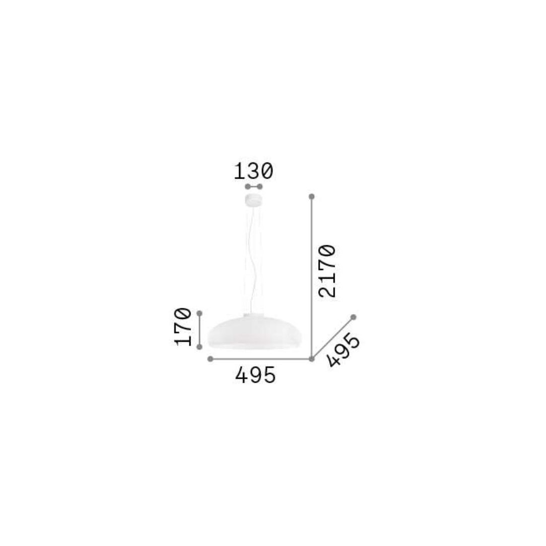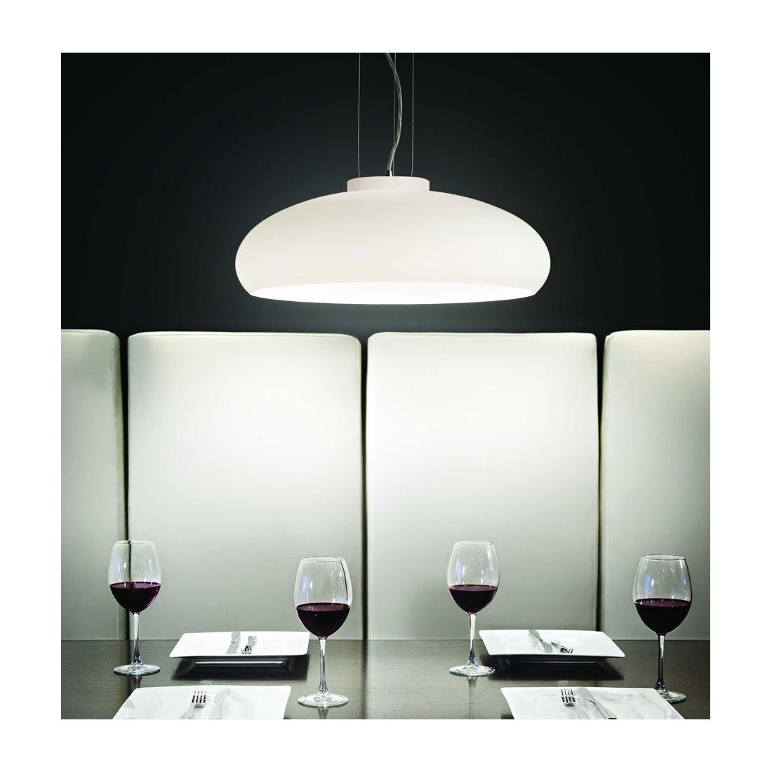 Sospensione singola dal design moderno composta da una piccola base a soffitto rotonda in metallo bianco e dal diffusore, a forma di campana schiacciata, realizzato in vetro bianco soffiato e acidato; è dotata di cavetti in acciaio regolabili in lunghezza, tramite dispositivi ferma cavo automatici, in modo da regolare l'altezza del punto luce come più vi necessita.
