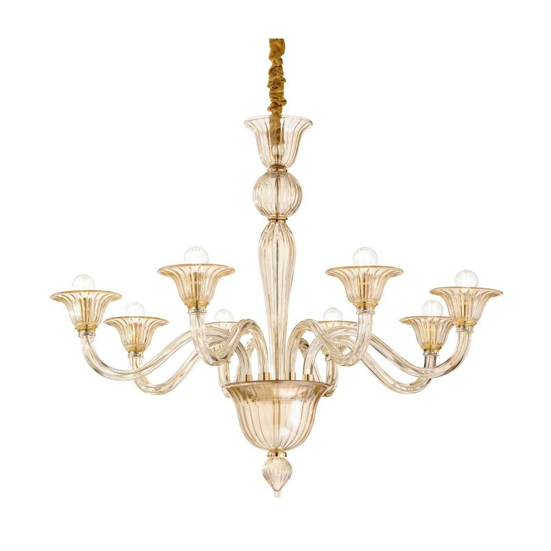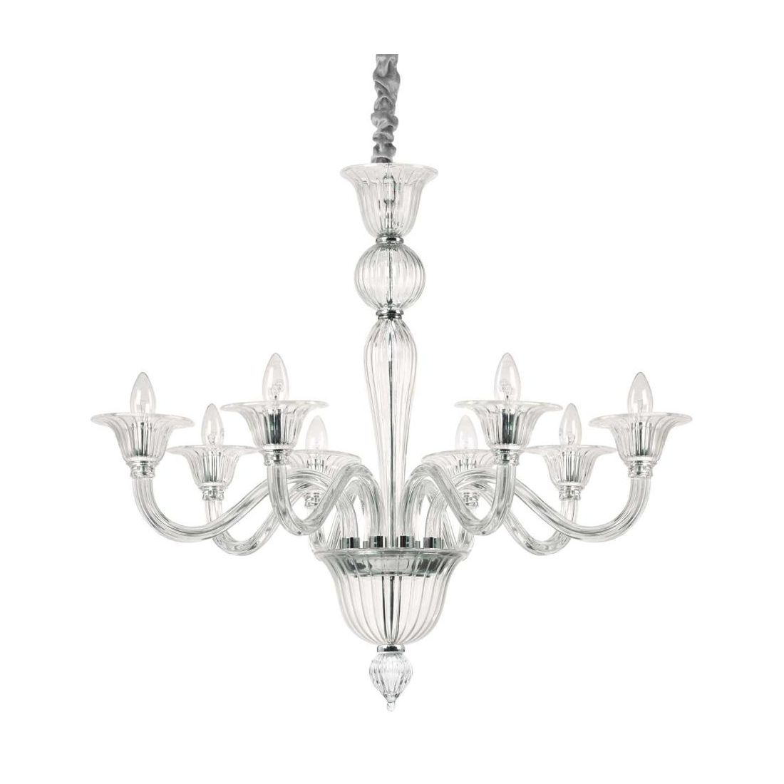 Lampadario a sospensione dallo stile classico composto da bracci arcuati realizzati in vetro soffiato, lavorato a mano, dove poggiano le bobeche in vetro che raccolgono le sorgenti luminose; la montatura e i copri portalampade sono realizzati in metallo con finitura Cromo oppure Oro e la catena viene rivestita in velluto.