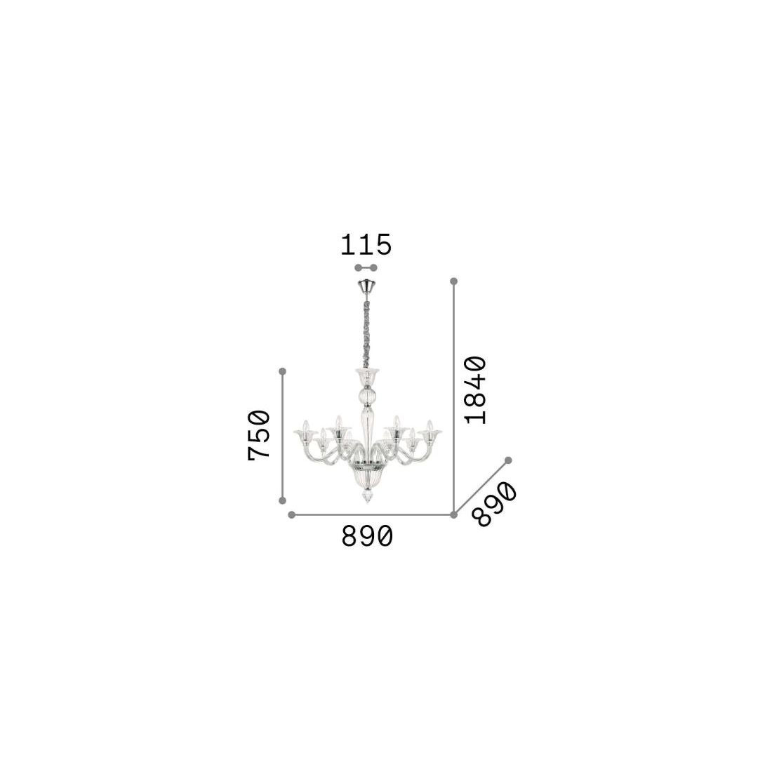 Il vetro di questo lampadario si può avere Trasparente (con dettagli cromati) oppure con finitura Ambra (con dettagli dorati) e viene prodotto in due diverse versioni, da scegliere in fase di ordine: con un diametro di cm 89 (con 8 luci) oppure con diametro di cm 120 (con 12 luci).