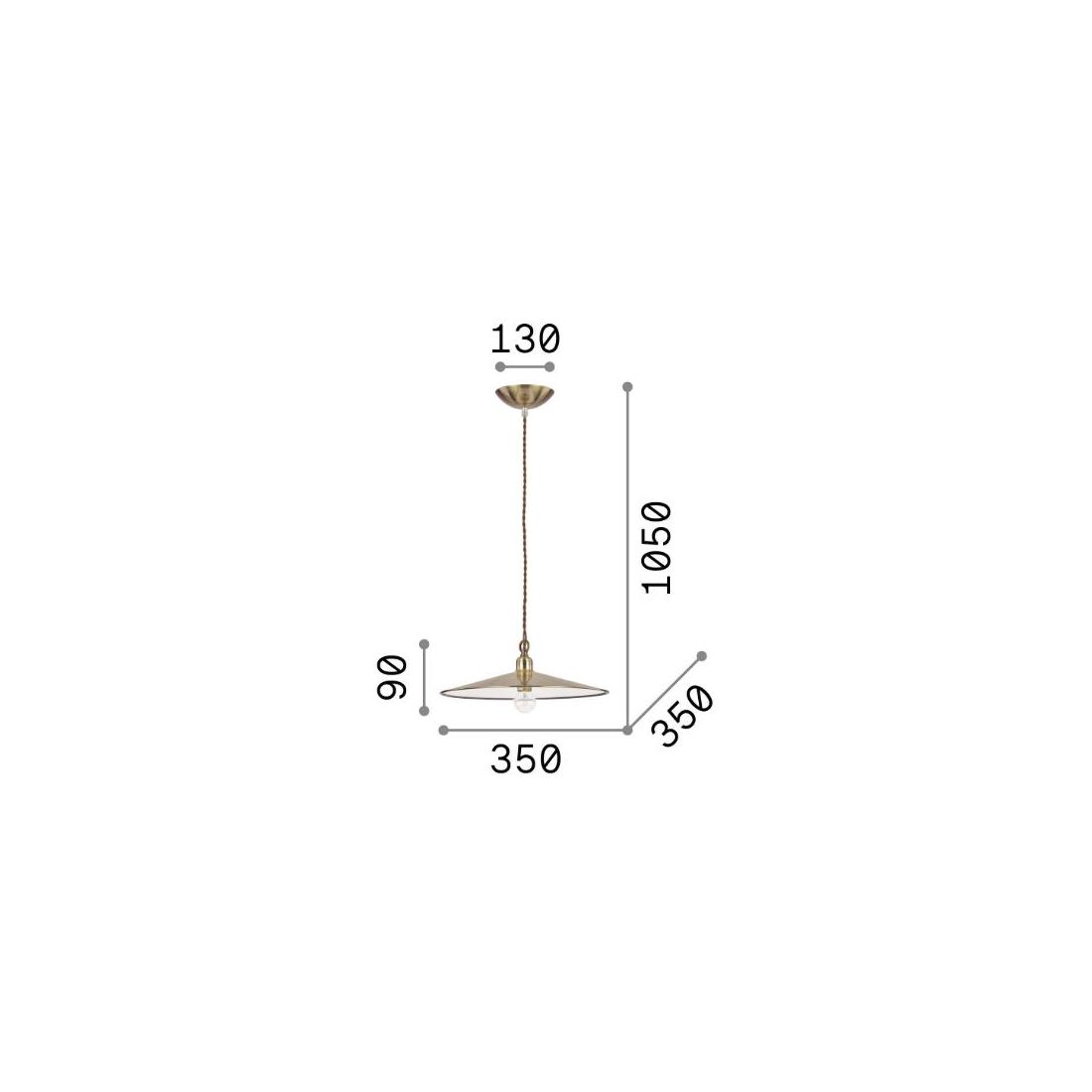 Lampadario rustico, dallo stile antico, che è composto da un rosone al soffitto, dal cavo intrecciato in tessuto, regolabile in lunghezza, e dal diffusore a forma di piatto, disponibile con finitura Brunito o Rame.