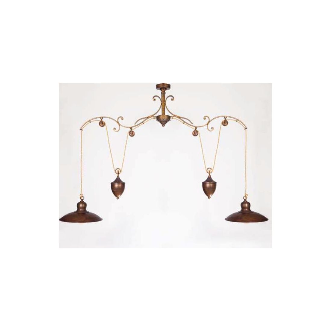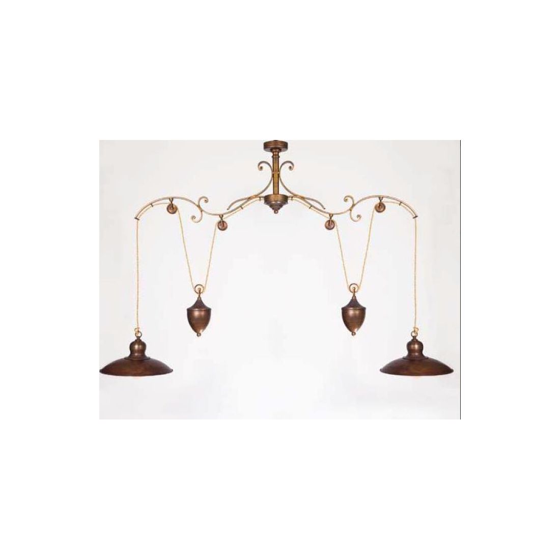 Lampadario in stile rustico, con attacco a plafoniera, con le 2 luci a saliscendi con una struttura con riccioli decorativi realizzata in ferro battuto, forgiato a mano, verniciato ottone, con piatti del diametro di cm 29 cadauno anch'essi realizzati in ottone invecchiato.