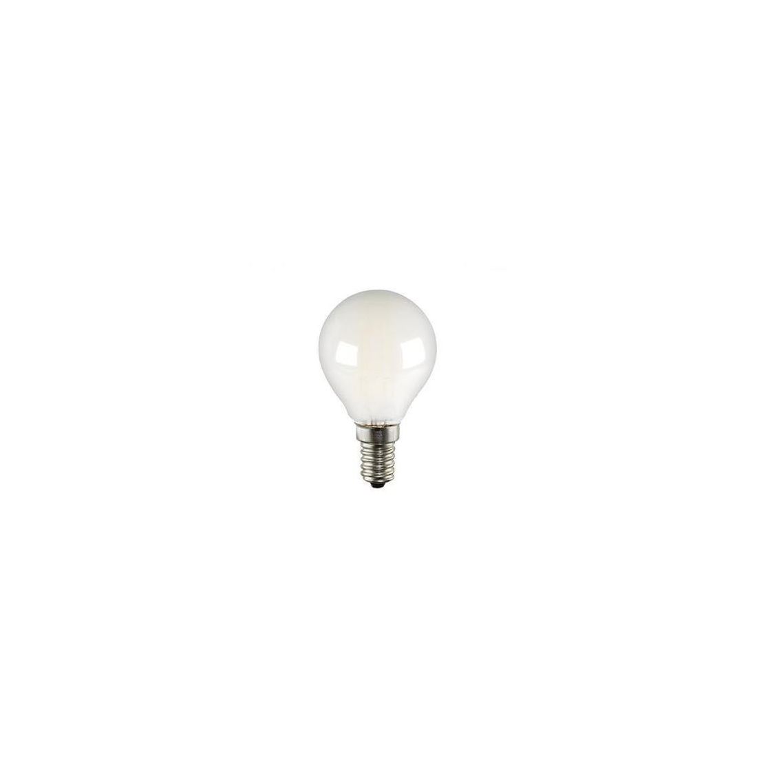 Lampadina filamento Opale Sfera in vetro che ha un diametro di 45 mm e un attacco E14, con consumo di 7w con 810 lumen di resa con luce 4000k (bianca naturale) e 800 lumen con luce 3000k (bianca calda).