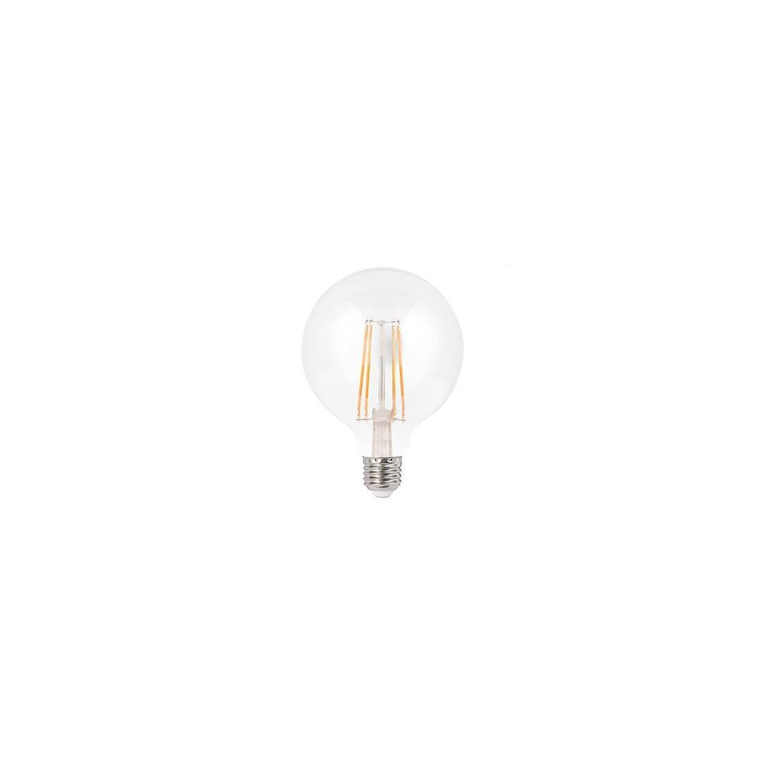 Lampadina led Globo a filamento con un diametro di 125 mm e un attacco E27, con consumo di 6w con 800 lumen di resa con luce calda 2700k e 800 lumen di resa con luce naturale 4000k, realizzata in vetro trasparente.