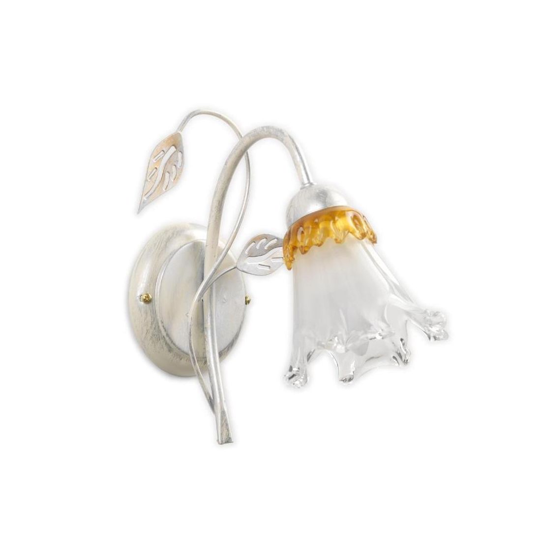 Applique classica con un solo punto luce, rivolto verso il basso, composta da una struttura interamente realizzata in metallo Bianco con spennellature Argento impreziosita da decorazioni a foglie tagliate al laser.