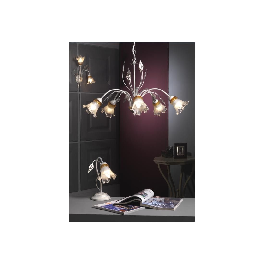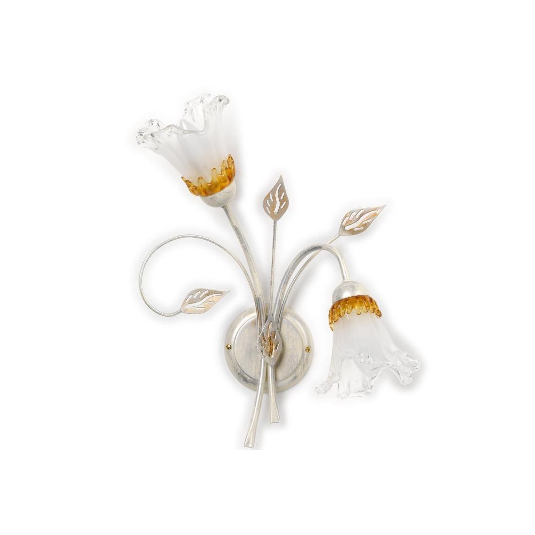 I 2 paralumi sono realizzati in vetro, a forma di calla, e la colorazione tenue con sfumature dorate, donerà un aspetto raffinato e di classe ai vostri ambienti; vengono arricchiti, infatti, nella parte superiore, da una colatura ambrata tirata manualmente sopra il bianco e che dona all'ambiente un tono caldo e intimo che farà splendere al massimo il vostro arredo.