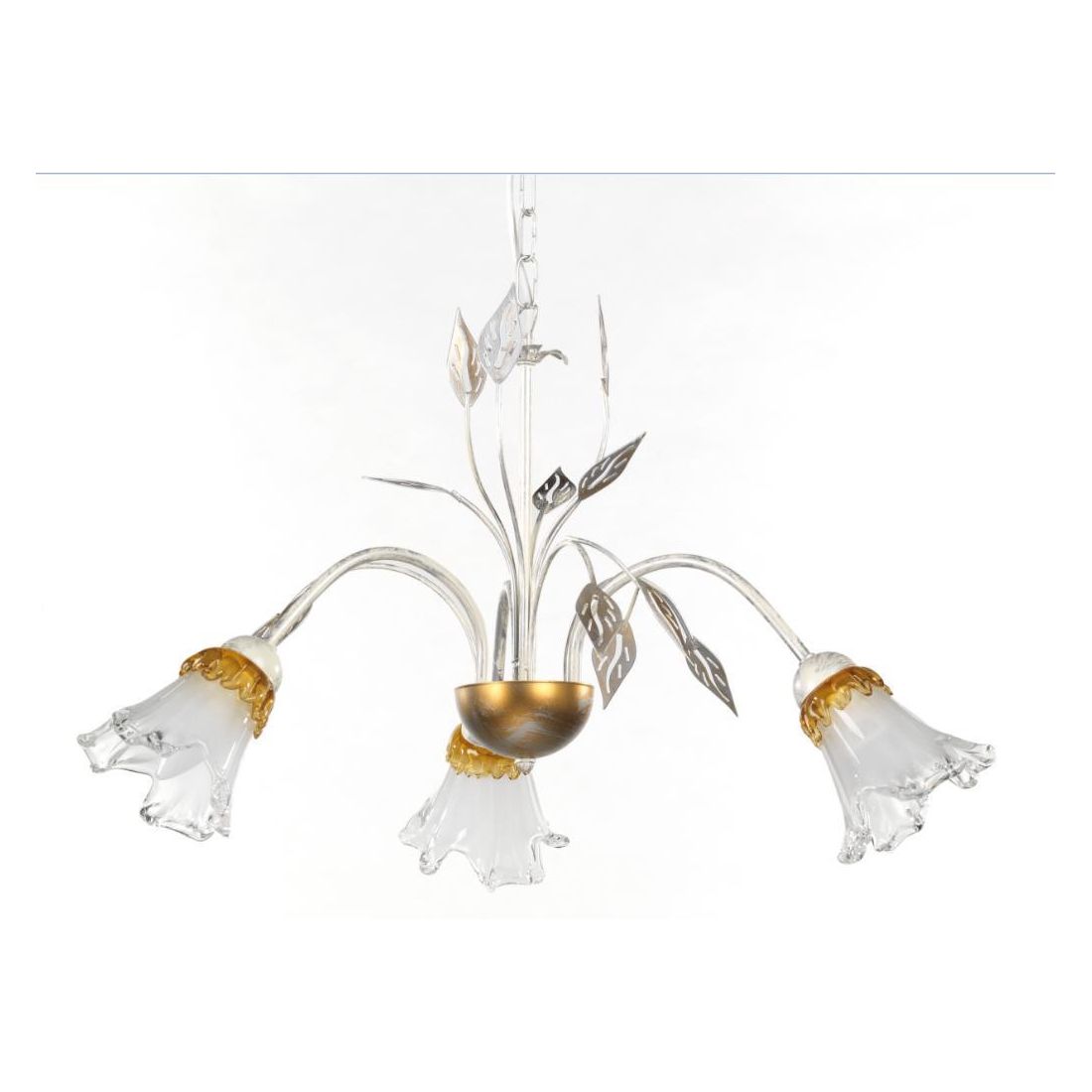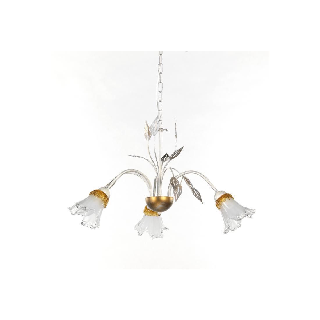 I 3 paralumi sono realizzati in vetro, a forma di calla, e la colorazione tenue con sfumature dorate, donerà un aspetto raffinato e di classe ai vostri ambienti; vengono arricchiti, infatti, nella parte superiore, da una colatura ambrata tirata manualmente sopra il bianco e che dona all'ambiente un tono caldo e intimo che farà splendere al massimo il vostro arredo.