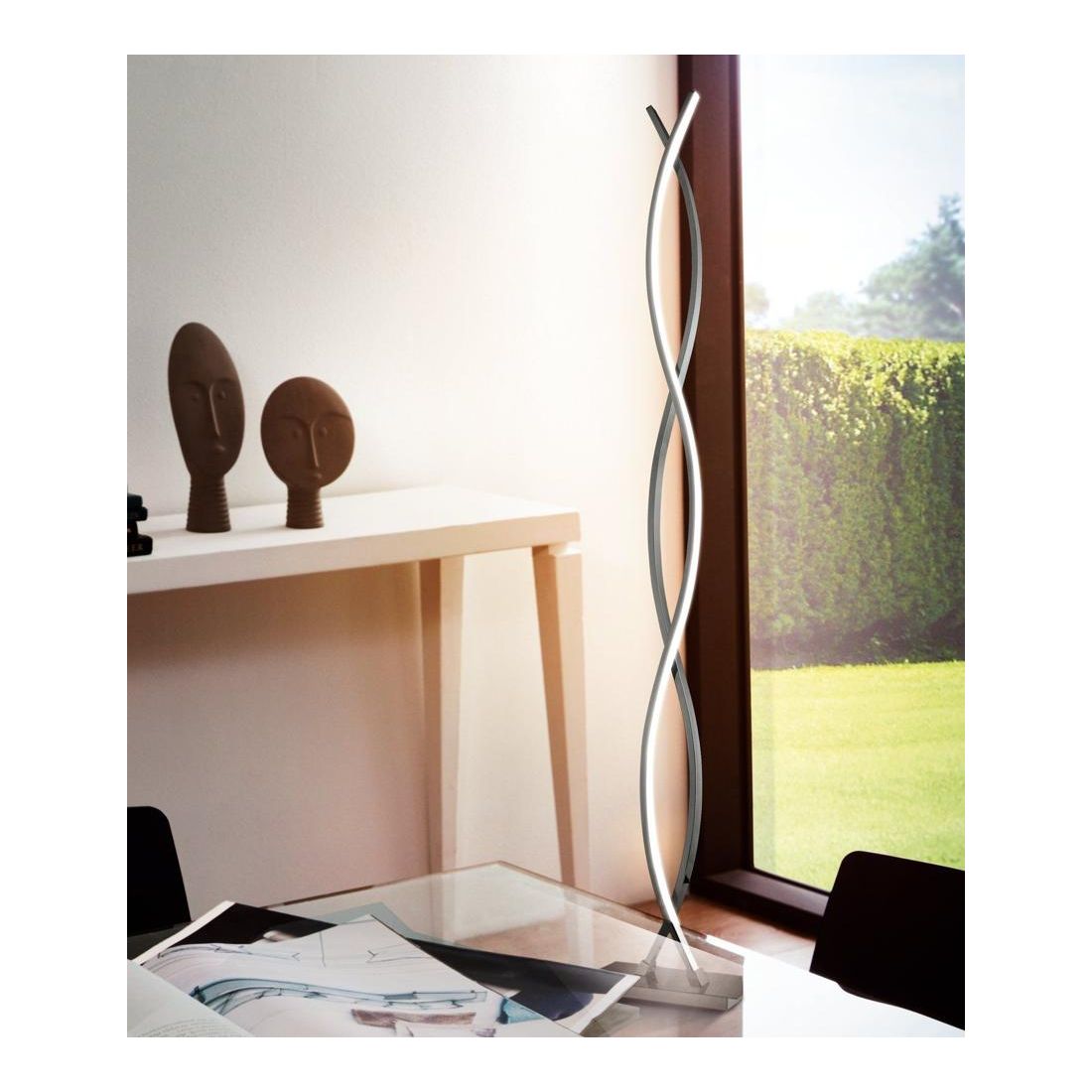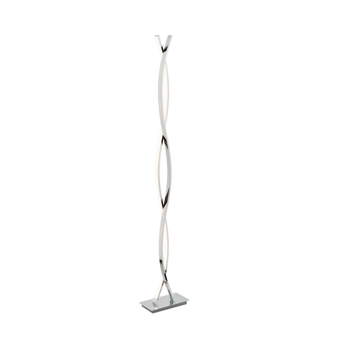 Lampada da terra con led integrato caratterizzata dalla sua forma intrecciata ed allungata; ha un design ultramoderno e sottile ed è costruita in metallo con finitura Cromo con un diffusore in policarbonato bianco che emana una luce diffusa contrapposta.
