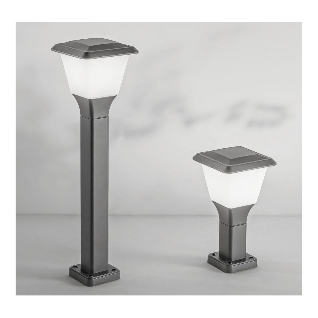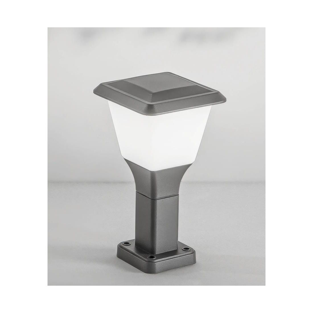Lampioncino da esterno con una forma squadrata, dallo stile classico, disponibile in due altezze: 30 cm o 60 cm che viene realizzato in alluminio con una finitura Antracite e che presenta un diffusore in policarbonato bianco opale che garantisce una diffusione della luce morbida e uniforme.