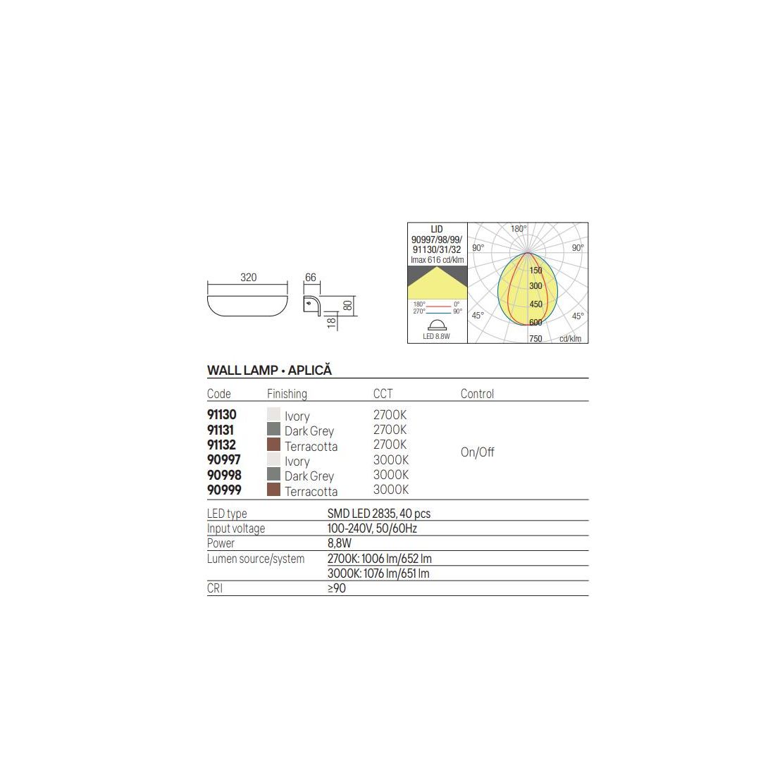 Sorgente luminosa: Led integrato da 8,8W - luce 2700k/lumen 1006 - luce 3000k/lumen 1076