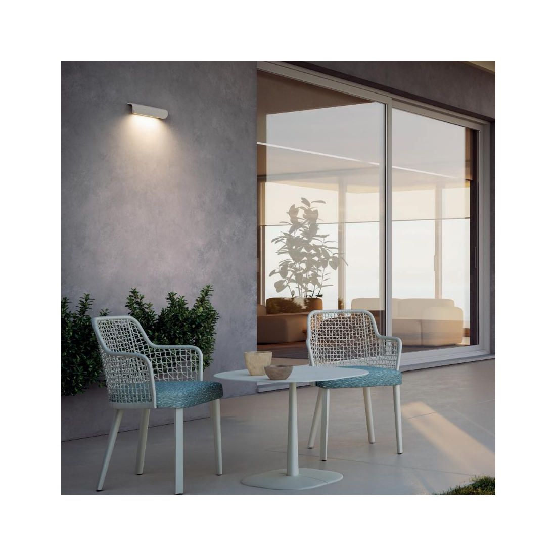 Lampada da parete che evoca l'immagine di un foglio leggermente curvato ideata per l'illuminazione di ambienti esterni come balconi, terrazzi, loggiati, porticati e facciate di edifici privati o commerciali.
