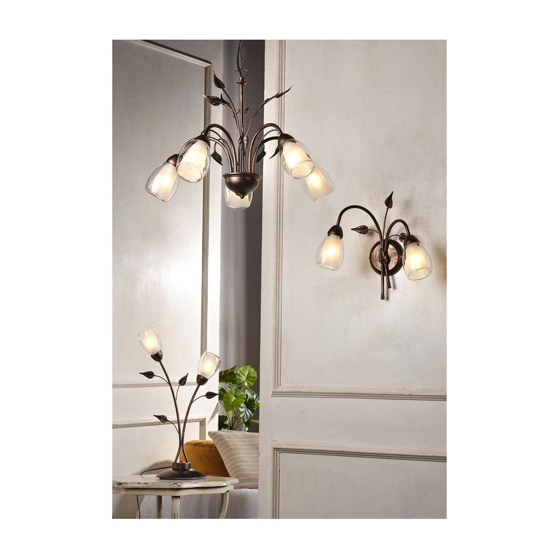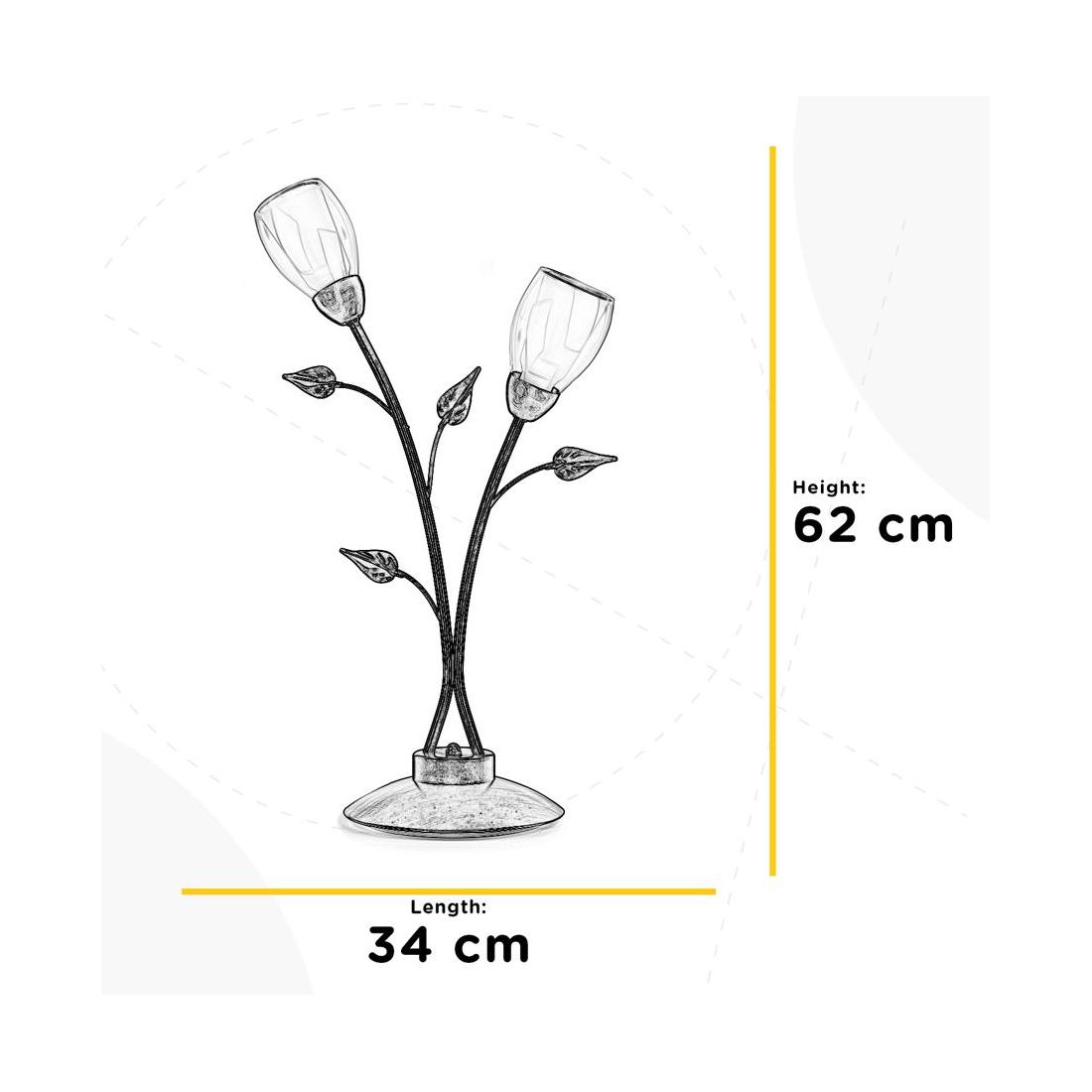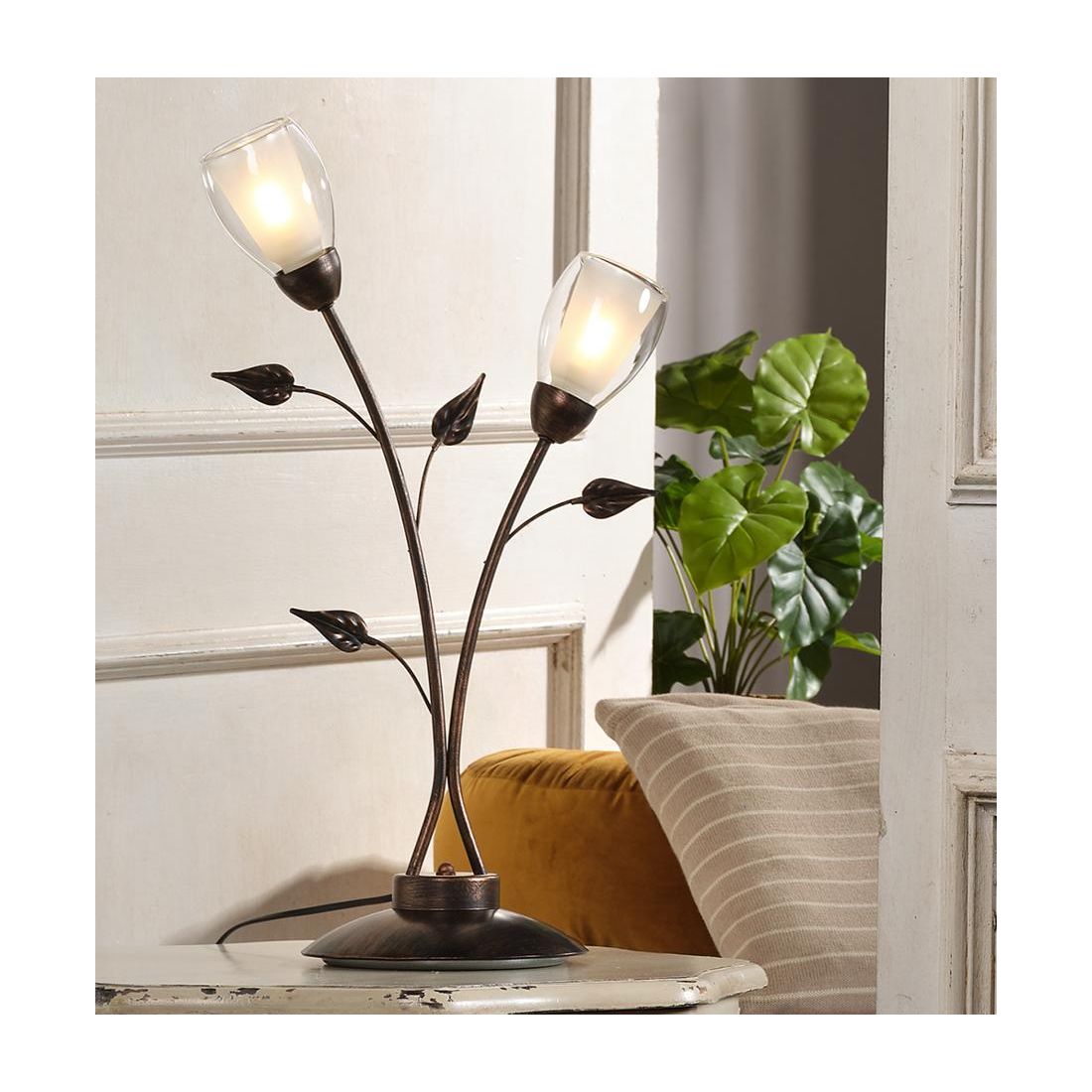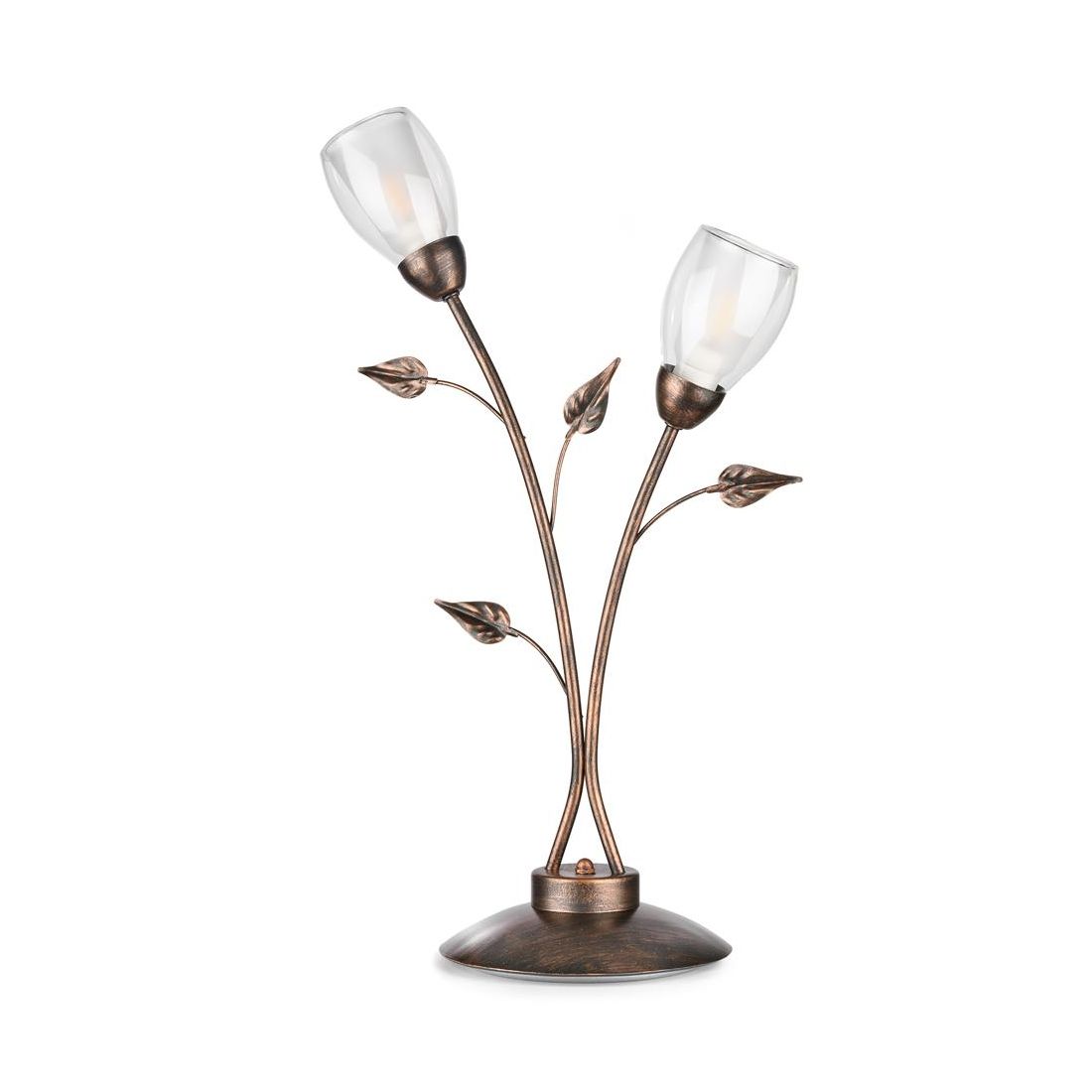 Lampada da tavolo dallo stile classico che si presenta con una struttura realizzata in metallo con finitura in Bronzo spennellato oro con 2 paralumi prodotti in vetro bianco trasparente che garantiscono una diffusione della luce omogenea e piacevole. Ad impreziosire ulteriormente il design contribuiscono piccole ed eleganti foglioline, posizionate strategicamente, per conferire un tocco di classe e artigianalità al prodotto.