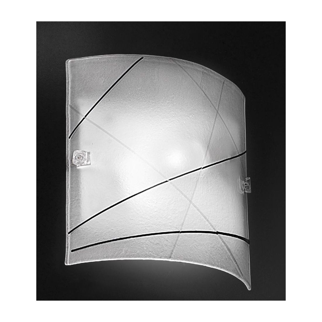 Applique con uno stile moderno, dalle linee semplici e pulite, che si presenta con una struttura interna in metallo e con il diffusore realizzato in vetro curvo bianco satinato con fili decorativi in colore Nero.