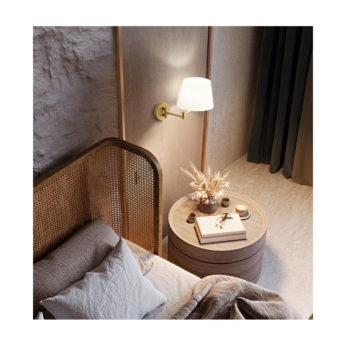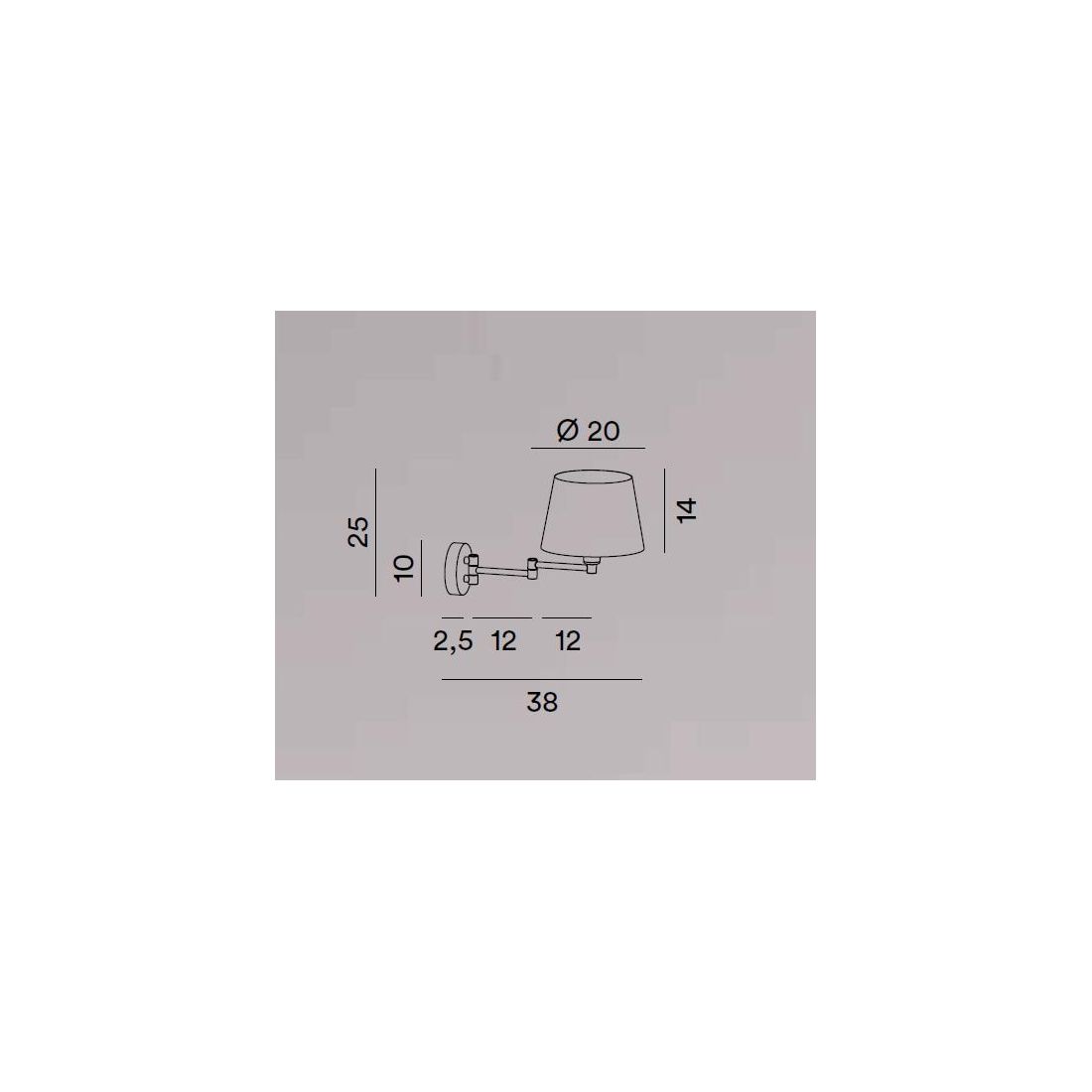 Lampada da parete dal design moderno composta da una piccola base a muro su cui è montato un braccio articolato con due snodi che consente di orientare facilmente il paralume sul piano orizzontale, adattando la direzione della luce secondo le proprie esigenze funzionali o decorative. Il paralume è realizzato in tessuto con interno plastificato, un abbinamento che garantisce una luce morbida e ben diffusa, mantenendo al tempo stesso una buona resistenza e facilità di pulizia. La possibilità di regolare il braccio rende questa applique particolarmente indicata per ambienti in cui è richiesto un punto luce flessibile e mirato.