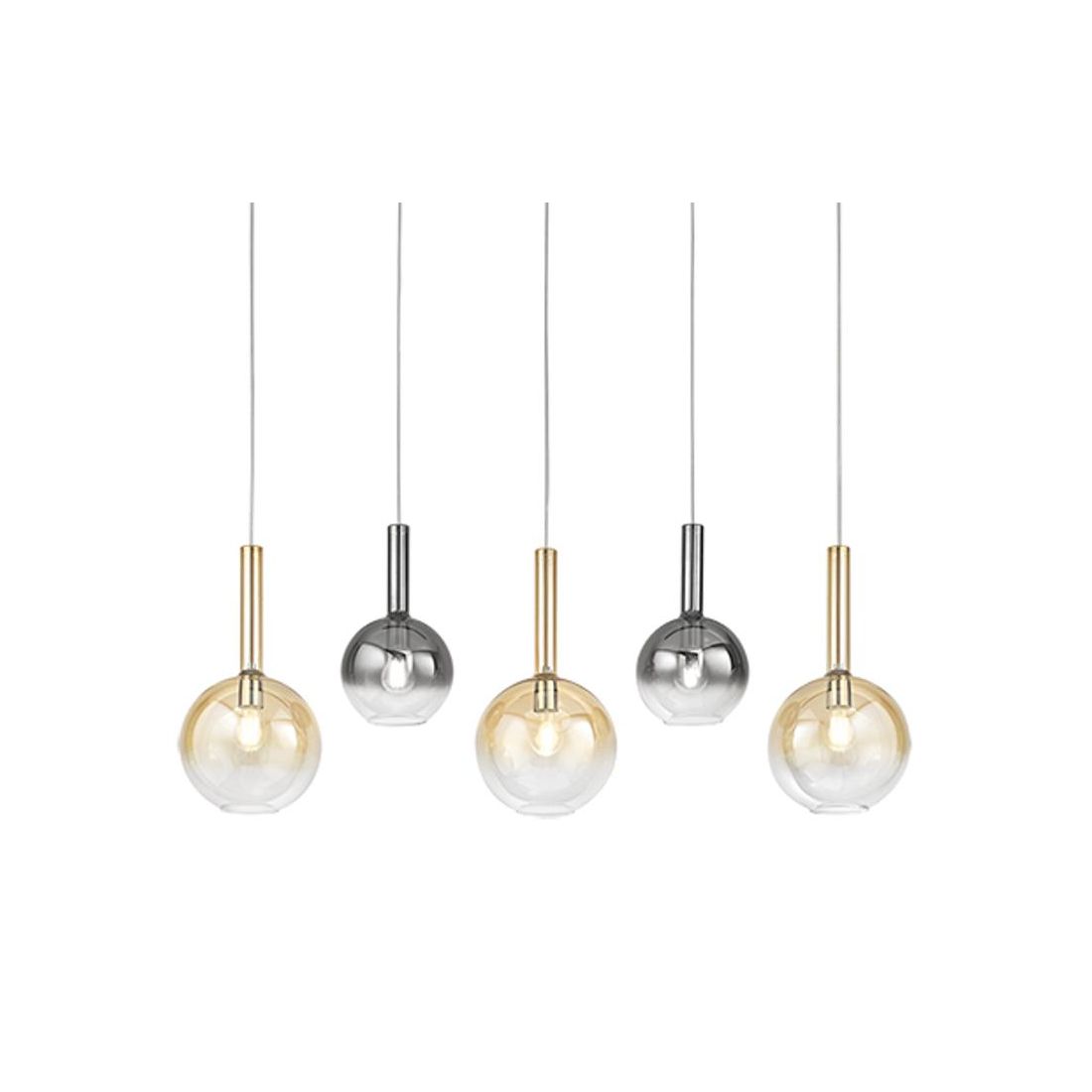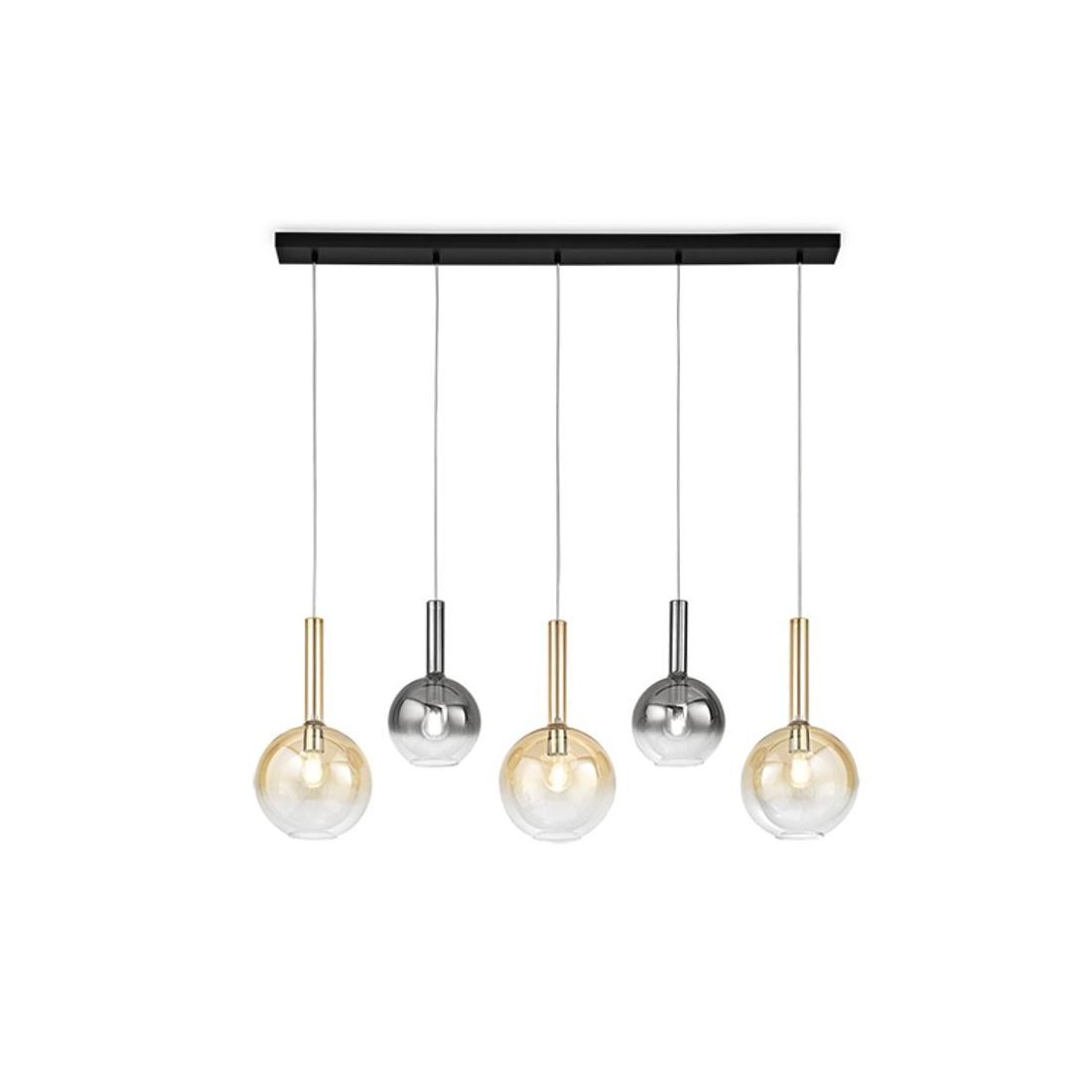 Lampadario a sospensione lineare, dal design moderno, che si presenta con una base a soffitto rettangolare realizzata in metallo con finitura Nera con cinque diffusori a sfera realizzati in vetro borosilicato trasparente sfumato in Ambra e Fumè (2 del diametro di cm 20 e 3 del diametro di cm 25). I cavetti, regolabili in lunghezza, permettono di modellare la composizione creando altezze sfalsate o perfettamente allineate a seconda dello stile che desiderate.