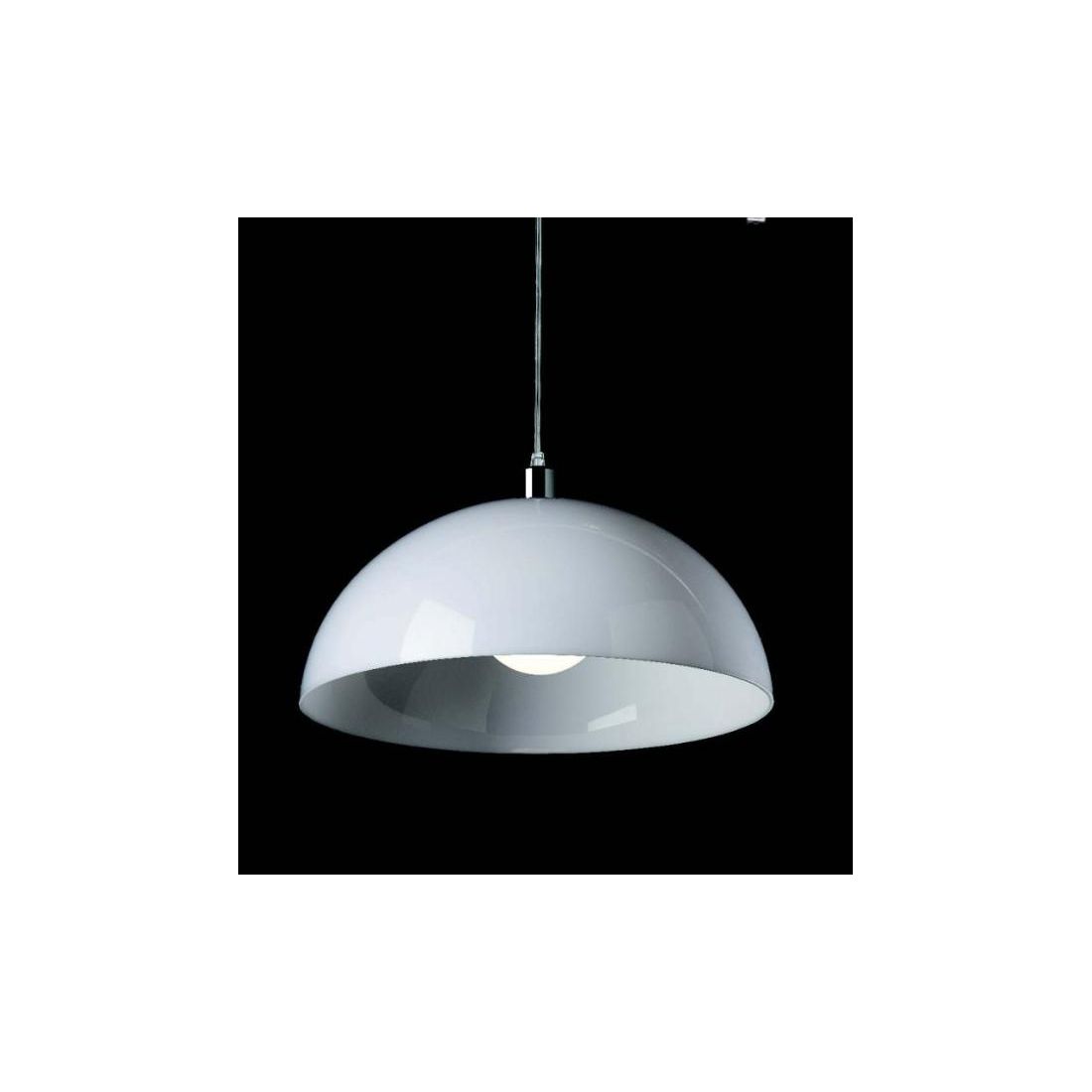 Sospensione con una forma a cupola, del diametro di cm 40, dallo stile moderno e contemporaneo, con una base a soffitto e dettagli realizzati in metallo cromato, con il diffusore in policarbonato colore Bianco e con cavo elettrico in silicone trasparente.