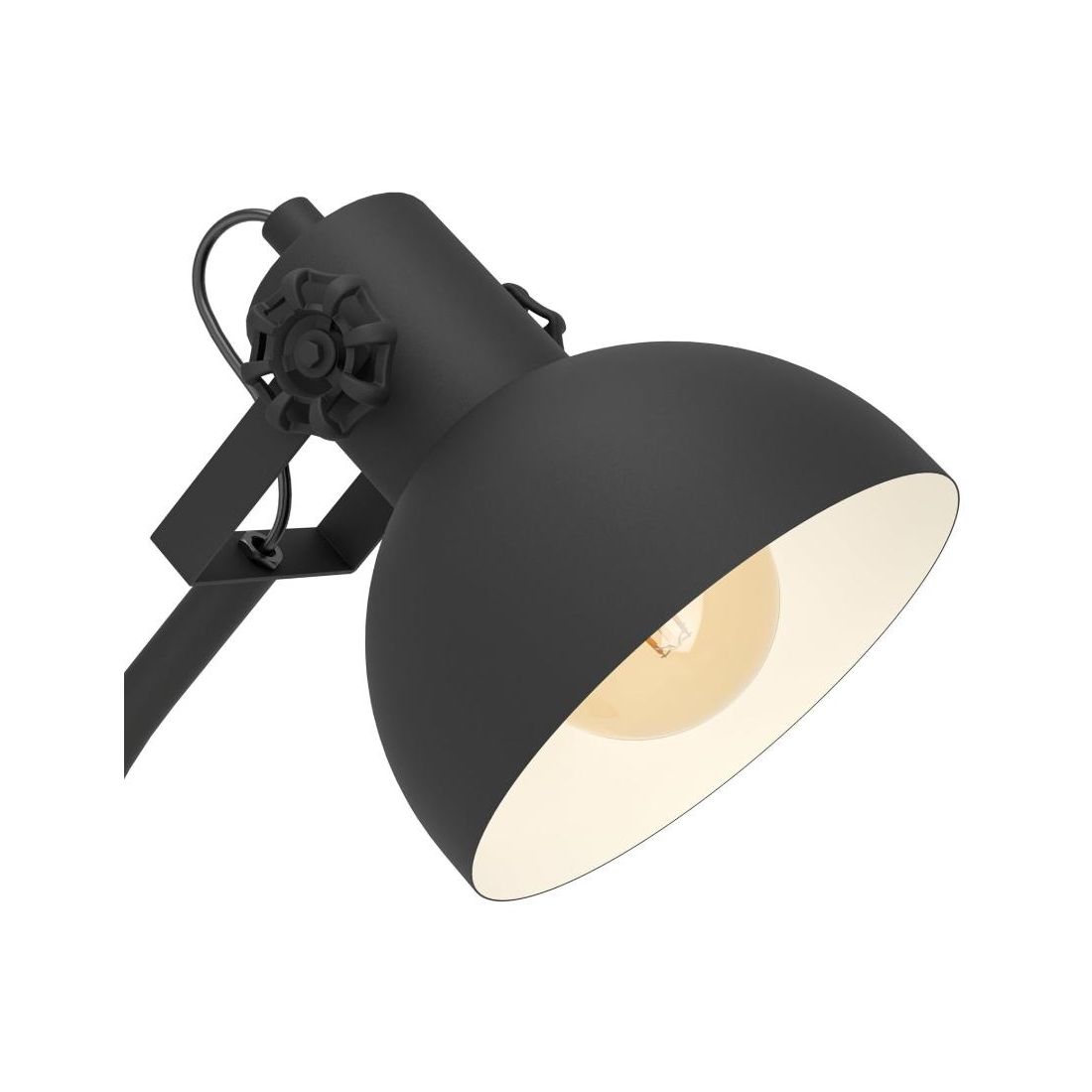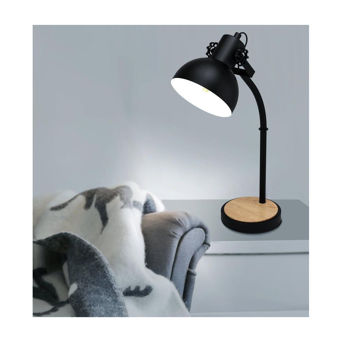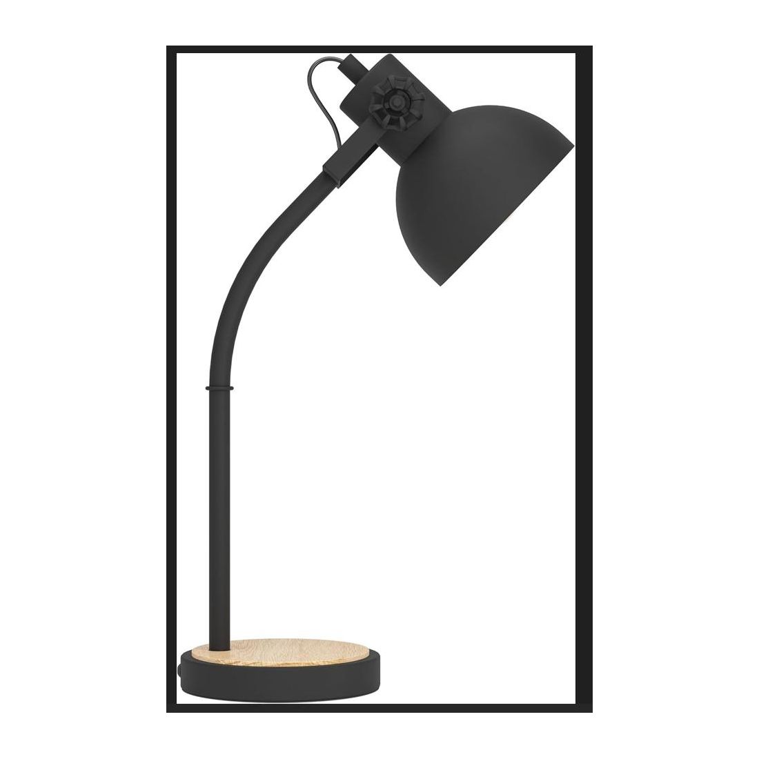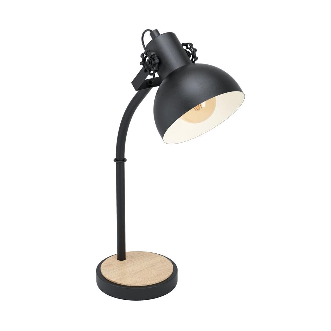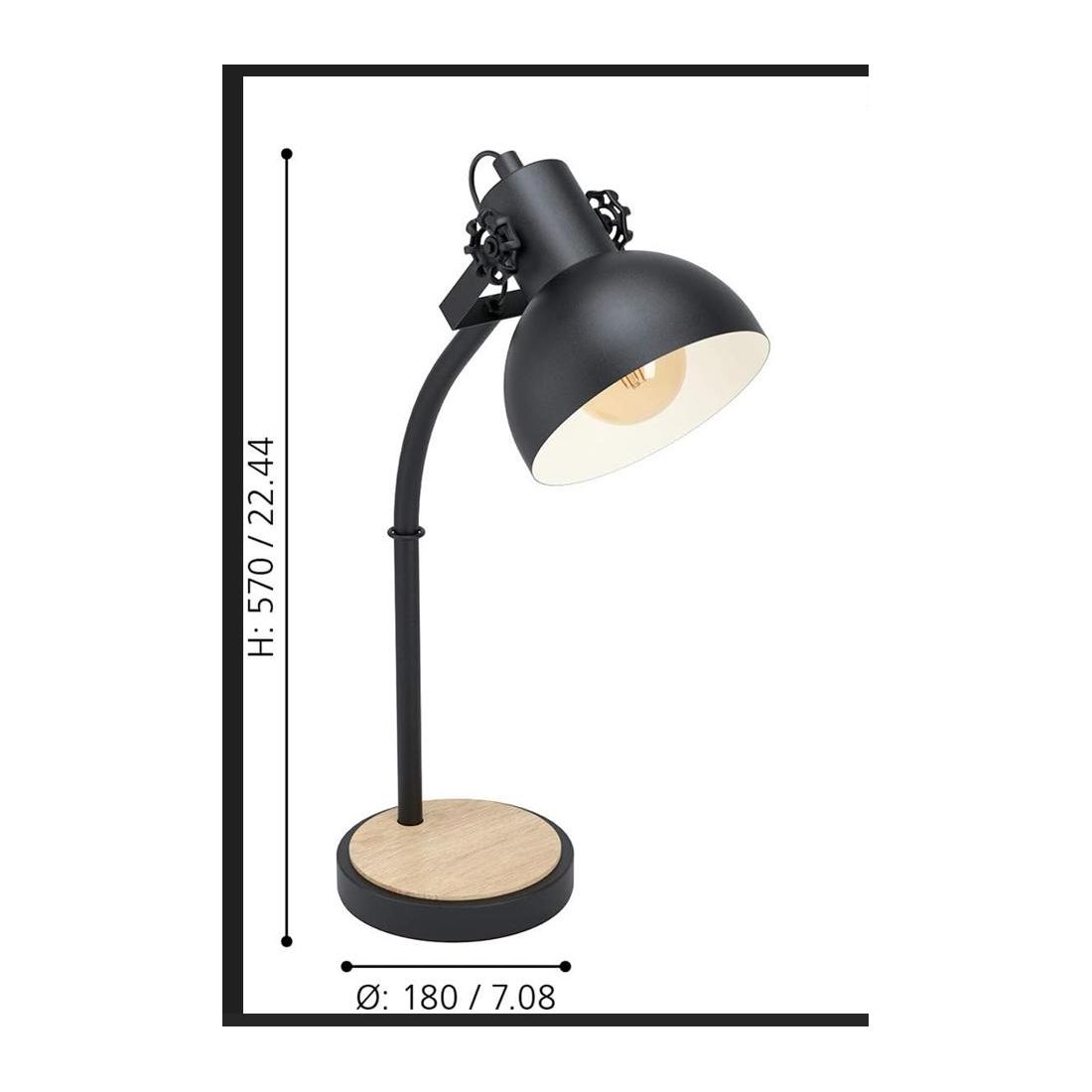 Lampada da tavolo dallo stile vintage composta da una struttura nera, alta 57 cm, con un paralume rotondo, orientabile, realizzato in acciaio Nero con l'interno verniciato in color crema che ne ottimizza la diffusione luminosa creando un'atmosfera calda e accogliente. La base in metallo nero è ricoperta da un cerchio realizzato in legno che ne conferisce un tocco accogliente.
