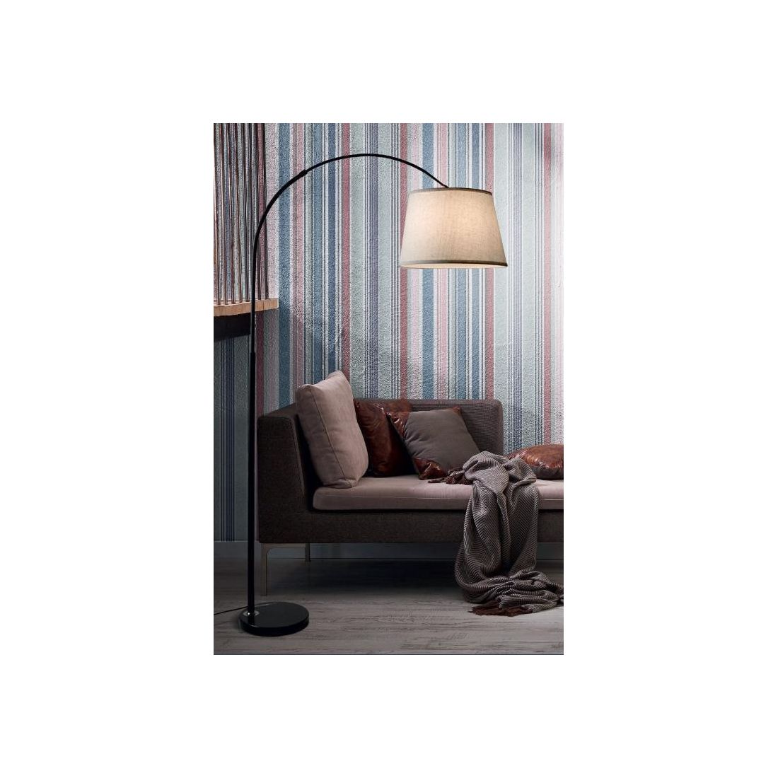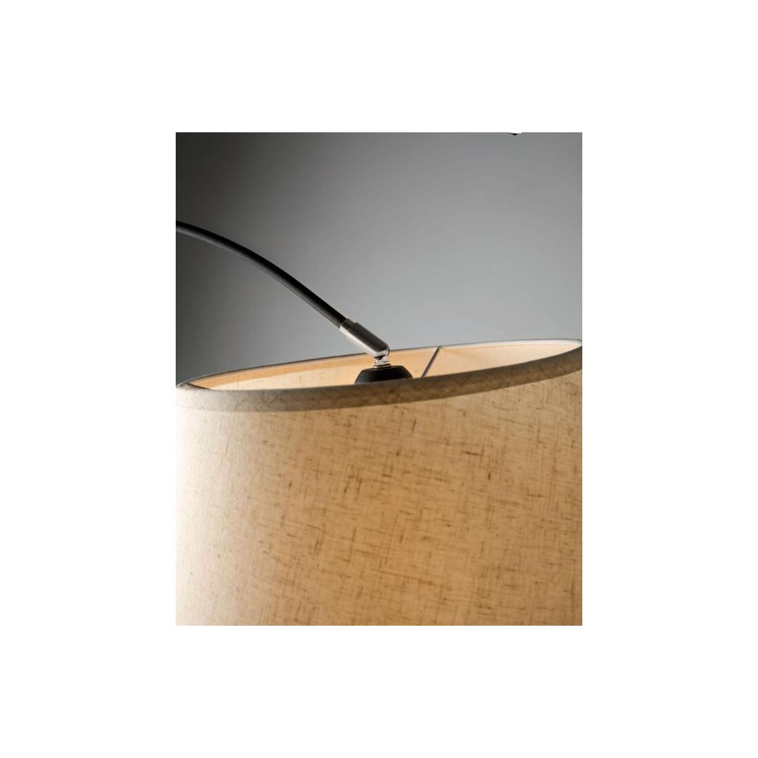 Piantana ad arco della Illuminando realizzata in metallo verniciato di nero con una base rotonda in marmo nero e con paralume orientabile colore sabbia con trama avorio che diffonde e proietta la luce principalmente verso il basso.
