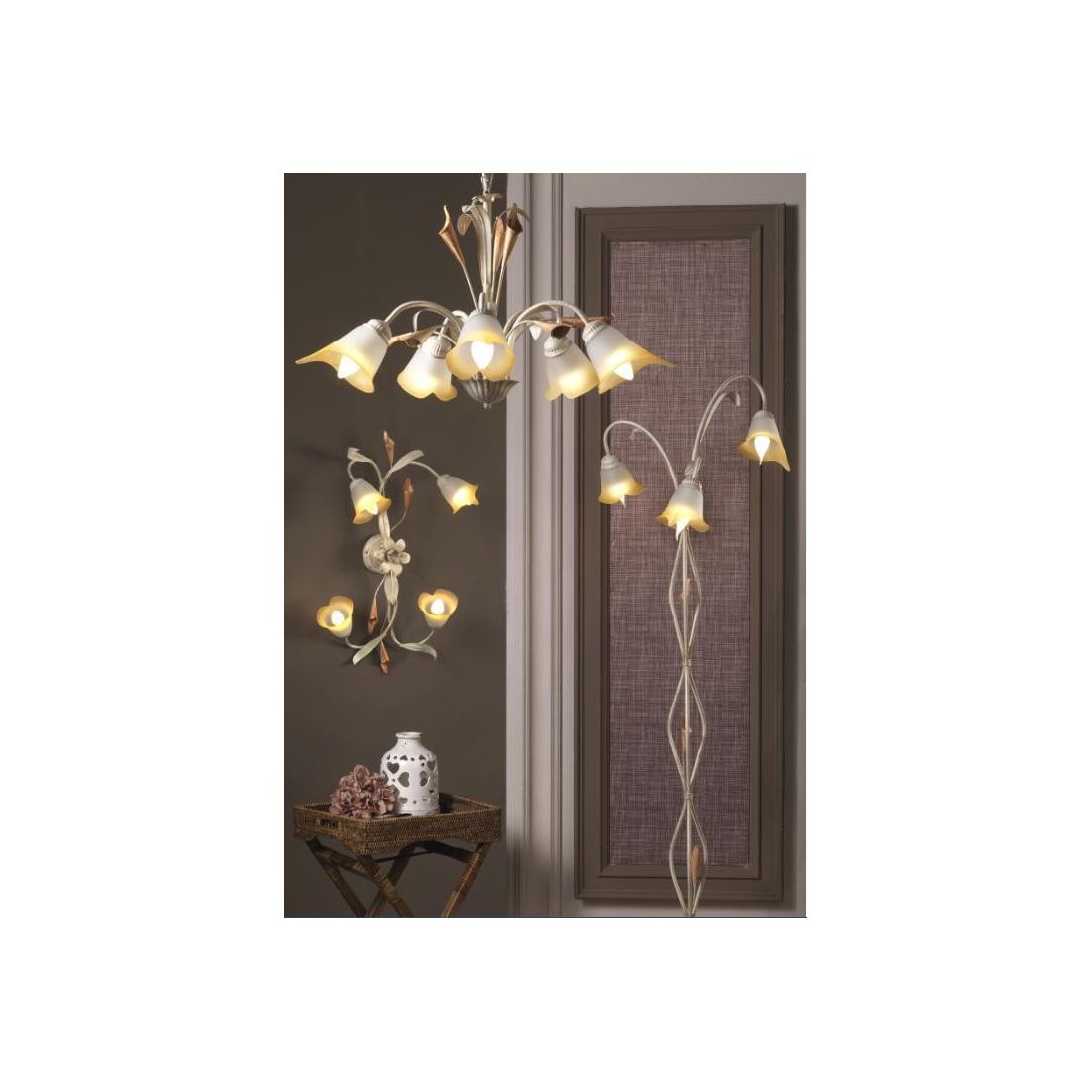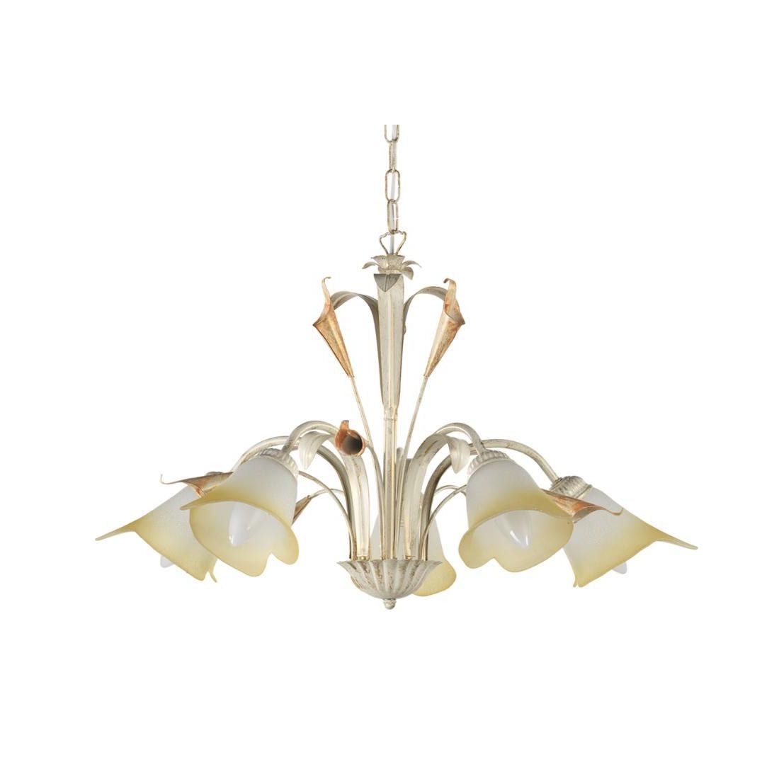 Lucrezia è un lampadario a sospensione, dallo stile classico e armonico, composto da una struttura interamente realizzata in metallo, lavorata a mano in Italia, arricchita da decorazioni con calle e foglie anch'esse in metallo di colore più acceso che riprendono le sfumature dei vetri. I 5 paralumi prendono la forma di una calla e sono realizzatil in vetro bianco sabbiato al suo interno che presentano delle sfumature ambrate sull'esterno.