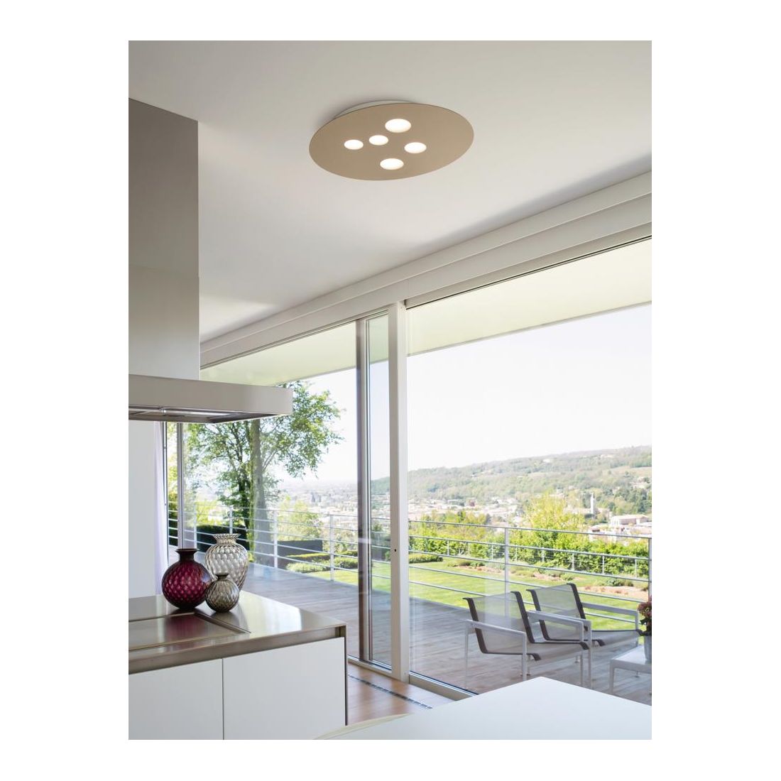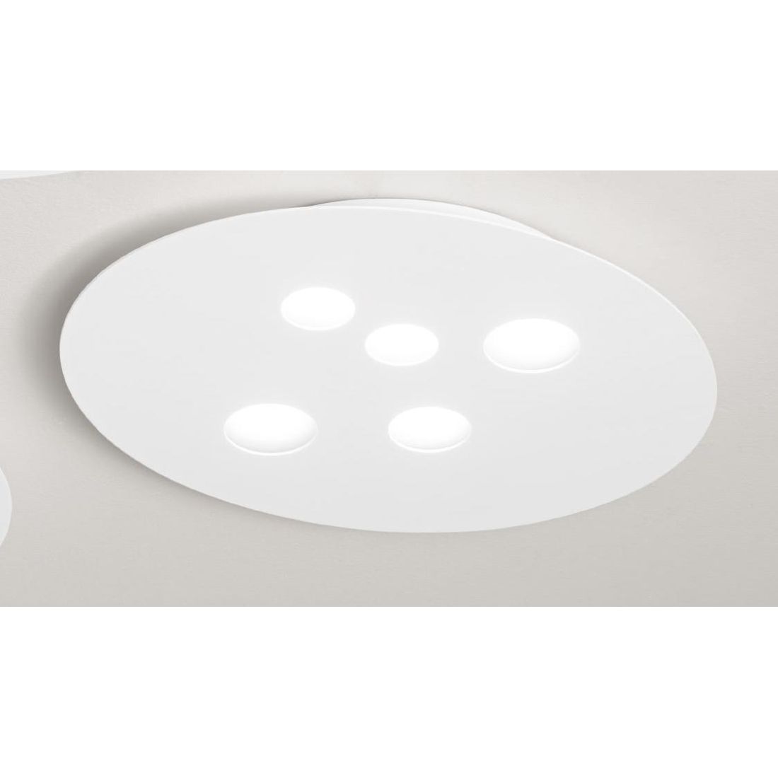 Una plafoniera con emissione di luce che enfatizza le superfici lisce della stanza e la esalta in tutta la sua semplicità; i suoi 5 portalampade dispongono di attacco GX53 e permettono un risparmio energetico importante.