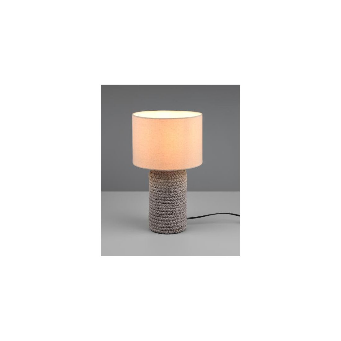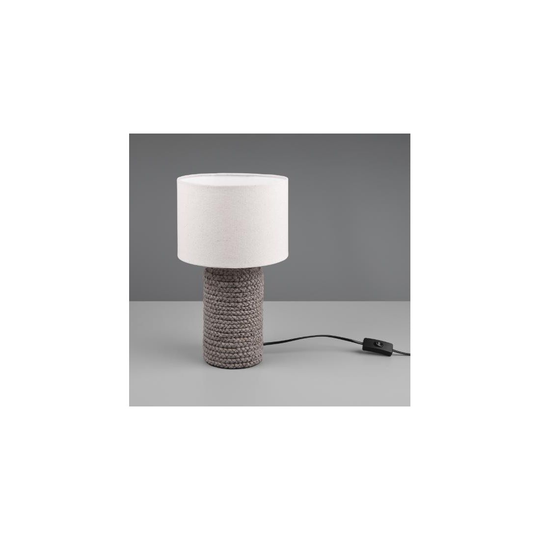 Lampada da tavolo, con un altezza di cm 38 , che si presenta con la base cilindrica realizzata in ceramica Marrone, con un "effetto corda" davvero molto particolare, e con un paralume, del diametro di cm 22, in tessuto Beige che emette una luce soffusa nella stanza.