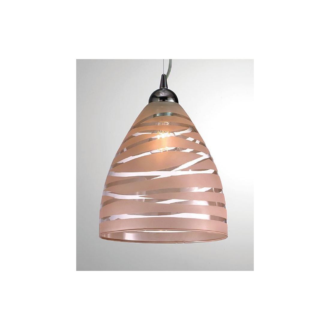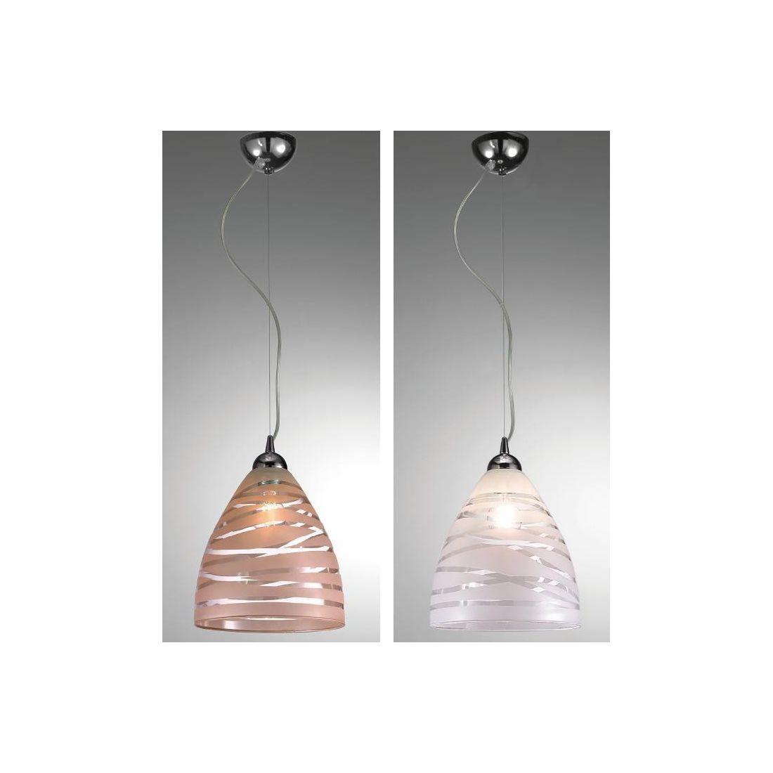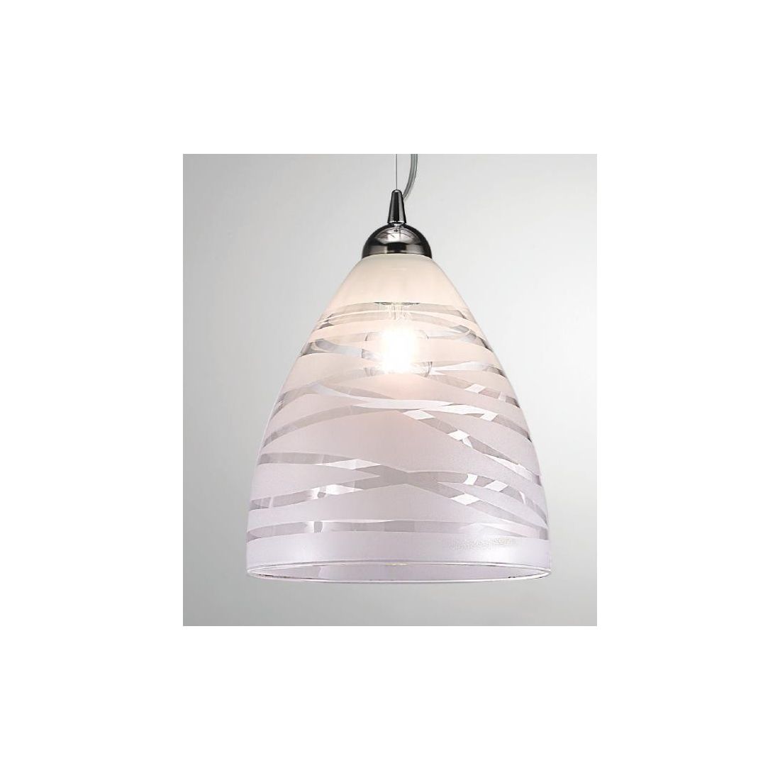 Lampadario a sospensione singolo in stile moderno composto dal rosone a soffitto e dalla montatura in metallo finitura cromo lucido e dal diffusore, che richiama la forma di una campana, realizzato in vetro trasparente con decorazione interna nel colore Bianco oppure Tortora (a vostra scelta).