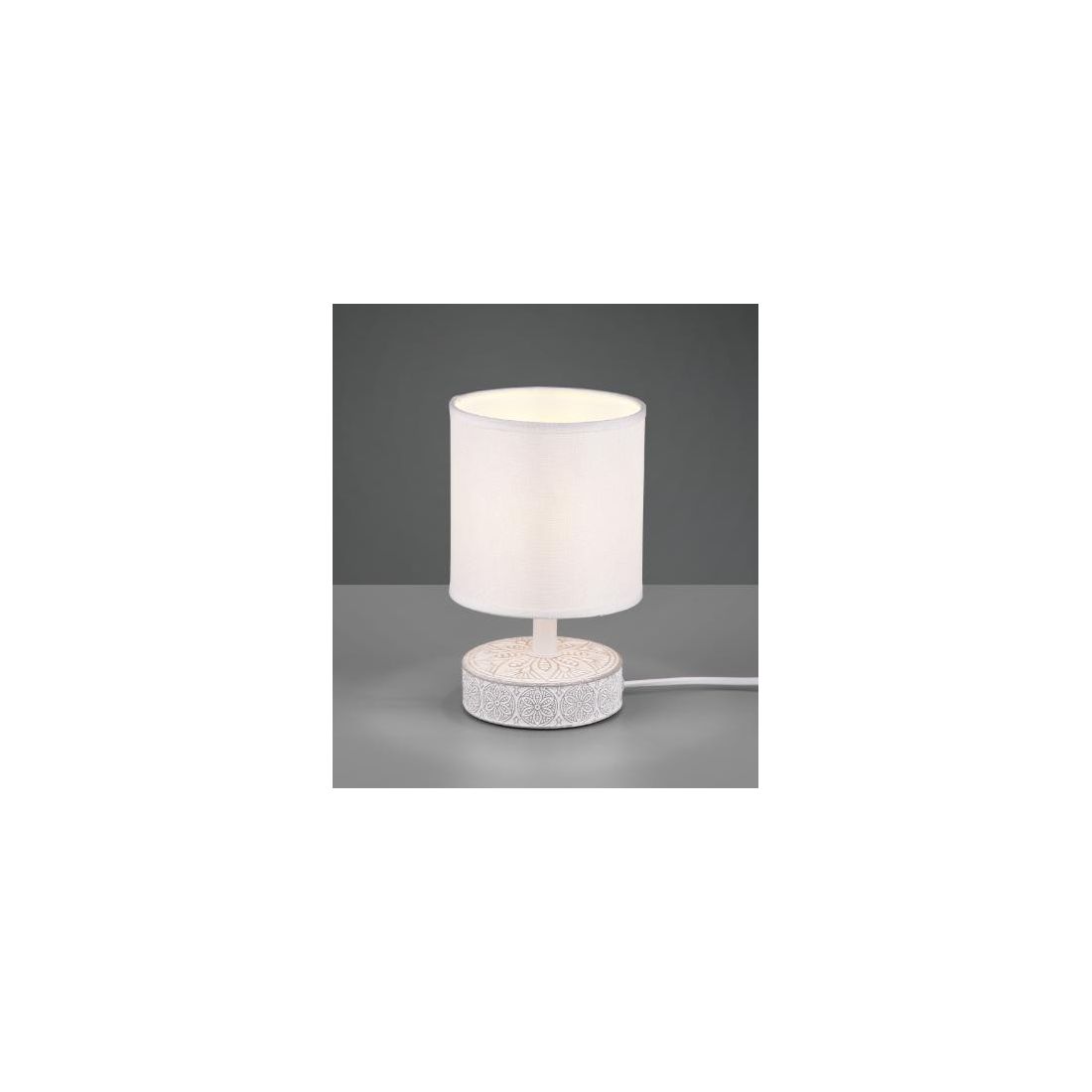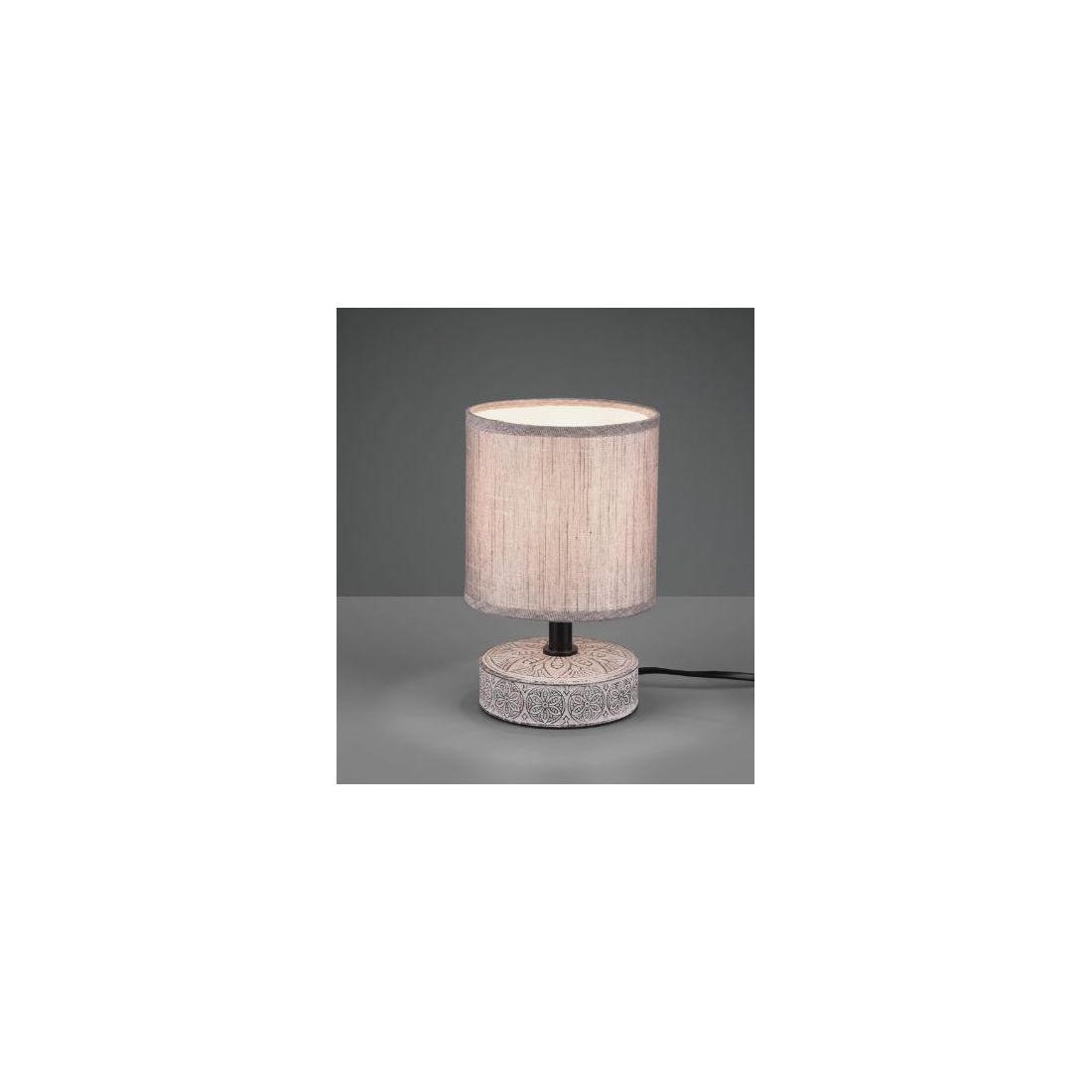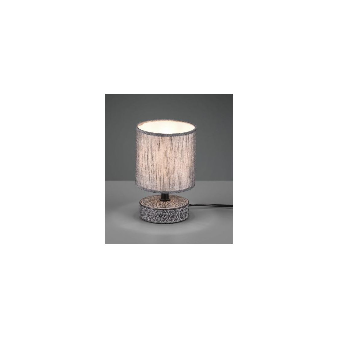 Lampada da tavolo, con un altezza di soli cm 20.5 , che si presenta con la base rotonda realizzata in ceramica con decori etnici intagliati, e con un paralume, del diametro di cm 13, in tessuto che emette una luce soffusa nella stanza.