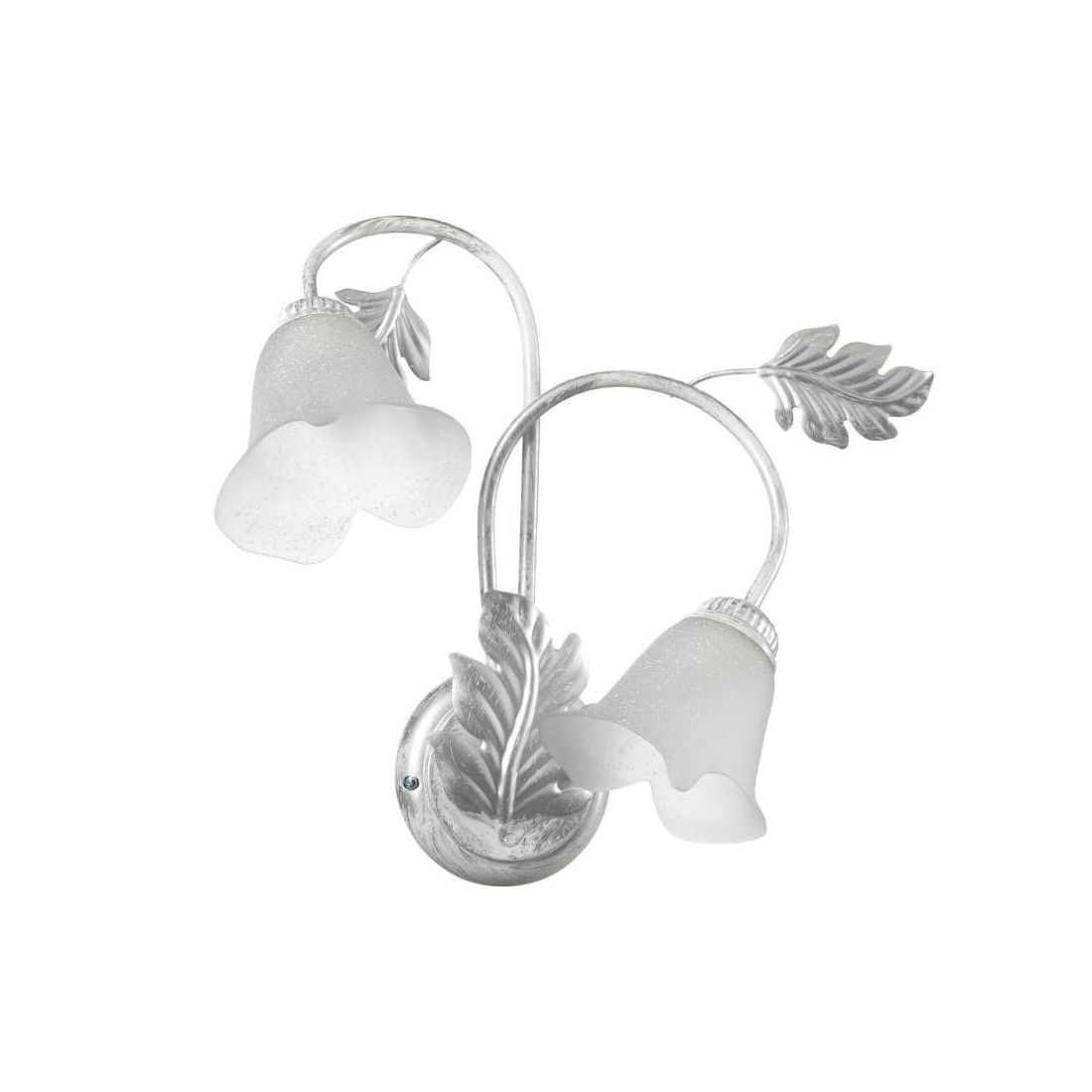 Si presenta con una struttura realizzata in metallo con finitura Bianca spennellata in argento che lo rende perfetto con tutte le tonalità di arredo. La struttura ha una decorazione a foglie, fatta interamente a mano, che si intona perfettamente con uno stile classico e tradizionale. I 2 paralumi, di forma floreale, sono realizzati in vetro bianco satinato all'interno con decoro scavo al suo esterno.