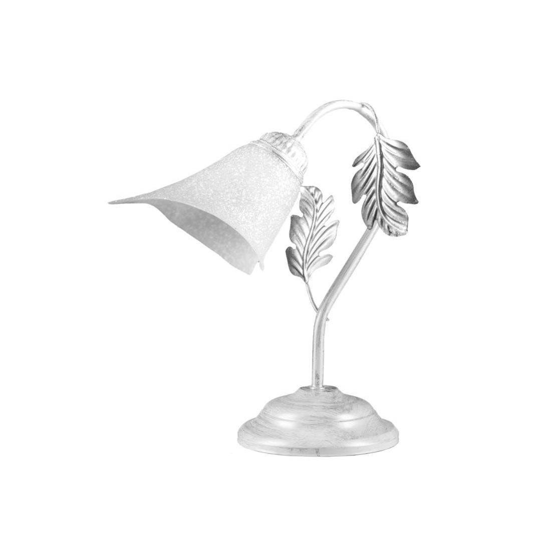 Si presenta con una struttura realizzata in metallo con finitura Bianca spennellata in argento che la rende perfetta con tutte le tonalità di arredo. La struttura ha una decorazione a foglie, fatta interamente a mano, che si intona perfettamente con uno stile classico e tradizionale. Il paralume, di forma floreale, è realizzato in vetro bianco satinato all'interno con decoro scavo al suo esterno.