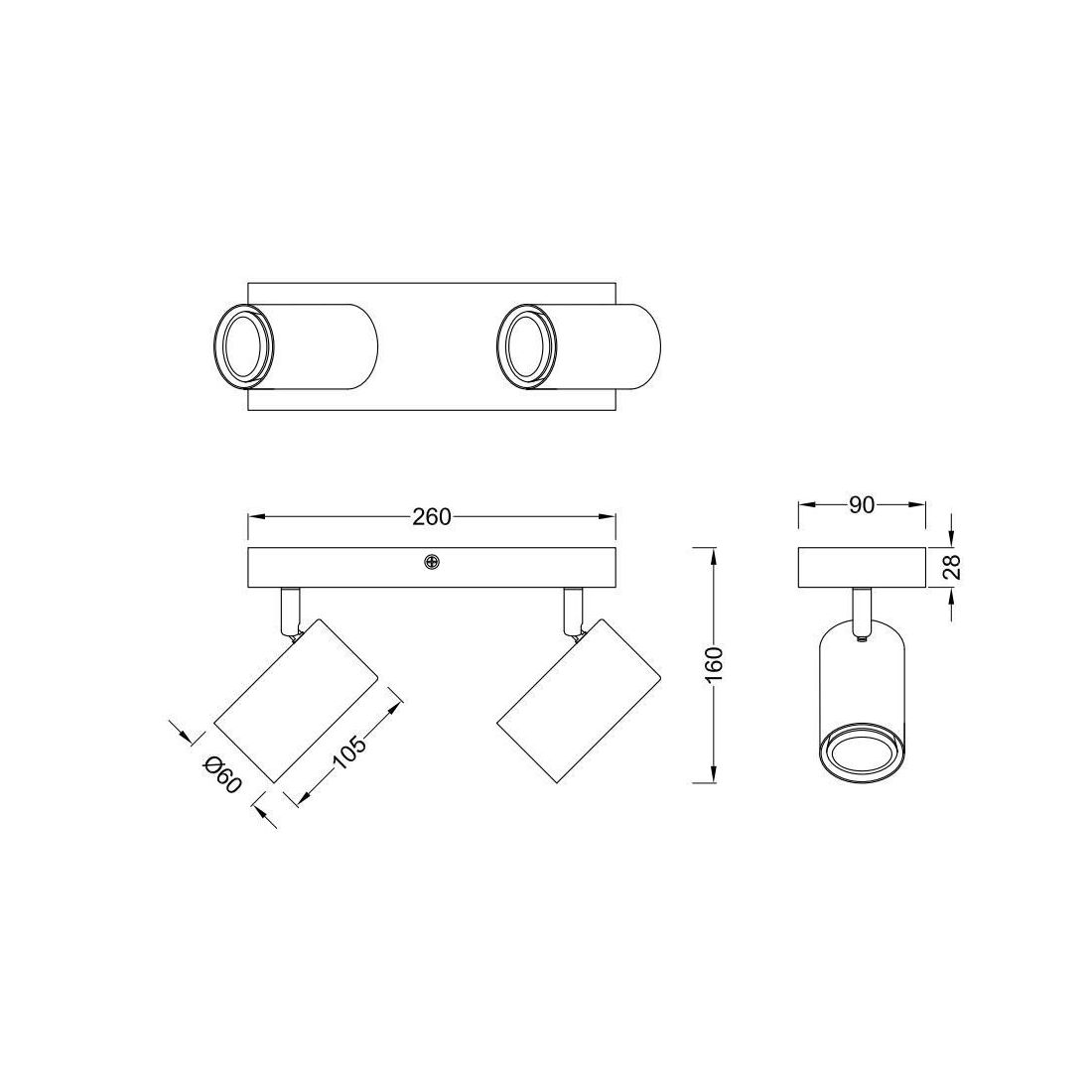 Faretto versatile e moderno, che può essere installato solo al soffitto, con luci orientabili, composto da una base rettangolare realizzata in legno e da due spot realizzati invece in metallo, disponibili in tre finiture: Bianco, Nero, Nichel satinato.