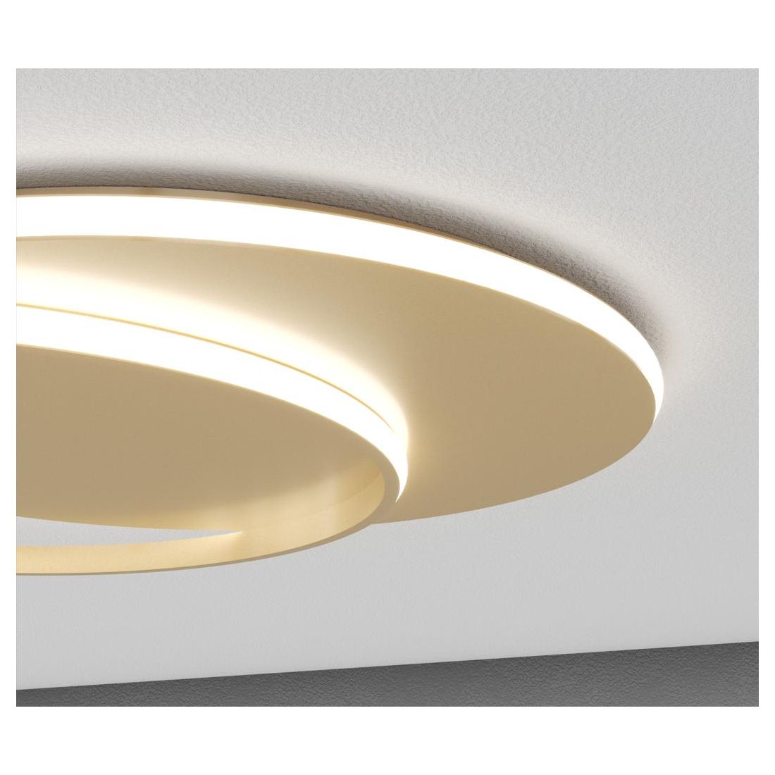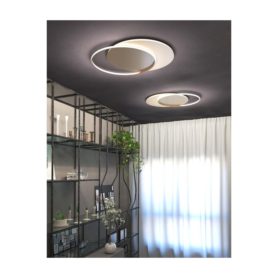 Lampada da parete o da soffitto, con un design moderno, che si presenta con una struttura formata da due cerchi, parzialmente sovrapposti, realizzati in metallo verniciato nelle finiture Bianco o Oro, che creano un effetto luminoso molto suggestivo e moderno.