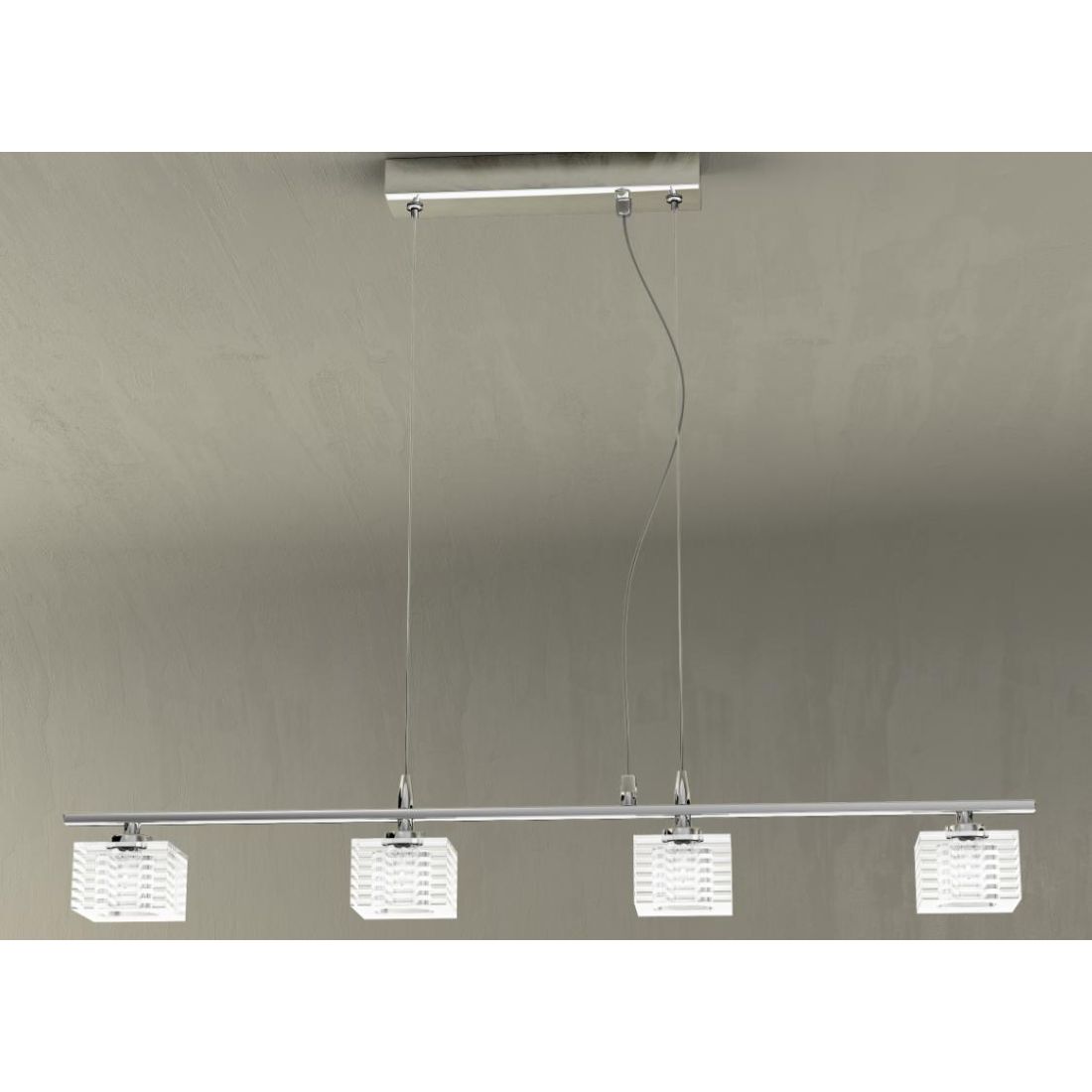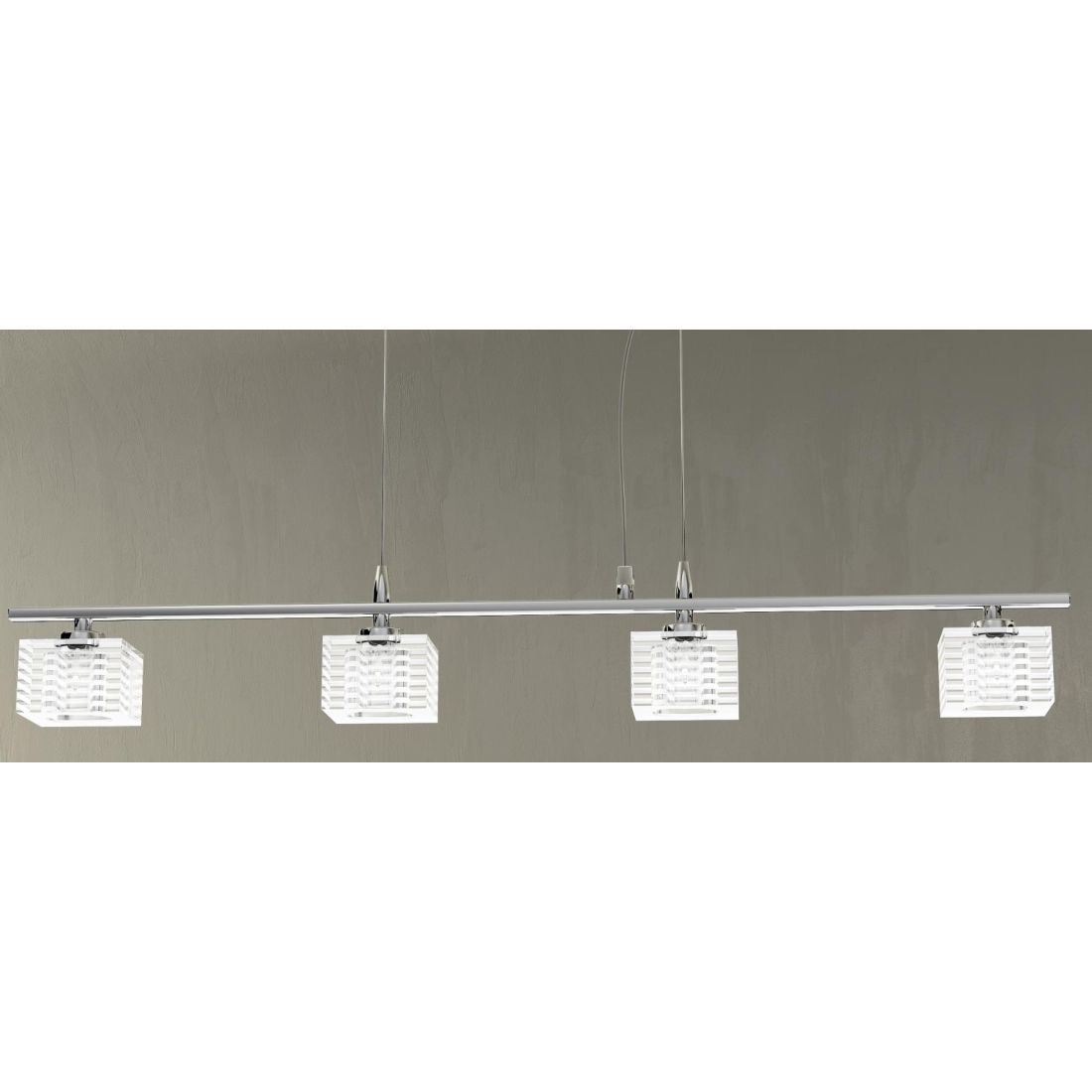 Sospensione lineare con 4 luci, dal design moderno, che si presenta con un rosone a soffitto e barra rettangolari in metallo cromato lucido e con i piccoli diffusori, a forma di cubo, realizzati in vetro trasparente con satinatura a righe orizzontali.