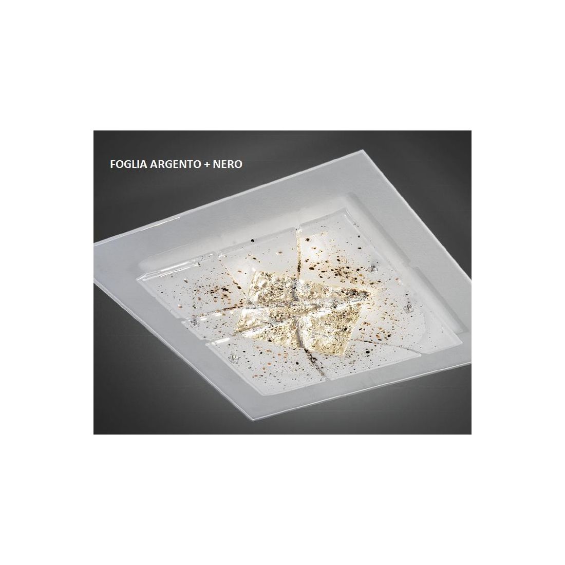 La particolarità della lavorazione del vetro centrale, l'utilizzo di avventurina e di graniglia colorata completata da foglia oro 24kt o foglia argento puro lo rendono un modello di grande effetto; ideale per illuminare e arredare soggiorni, salotti, ingressi o corridoi, uffici ma anche camere da letto.