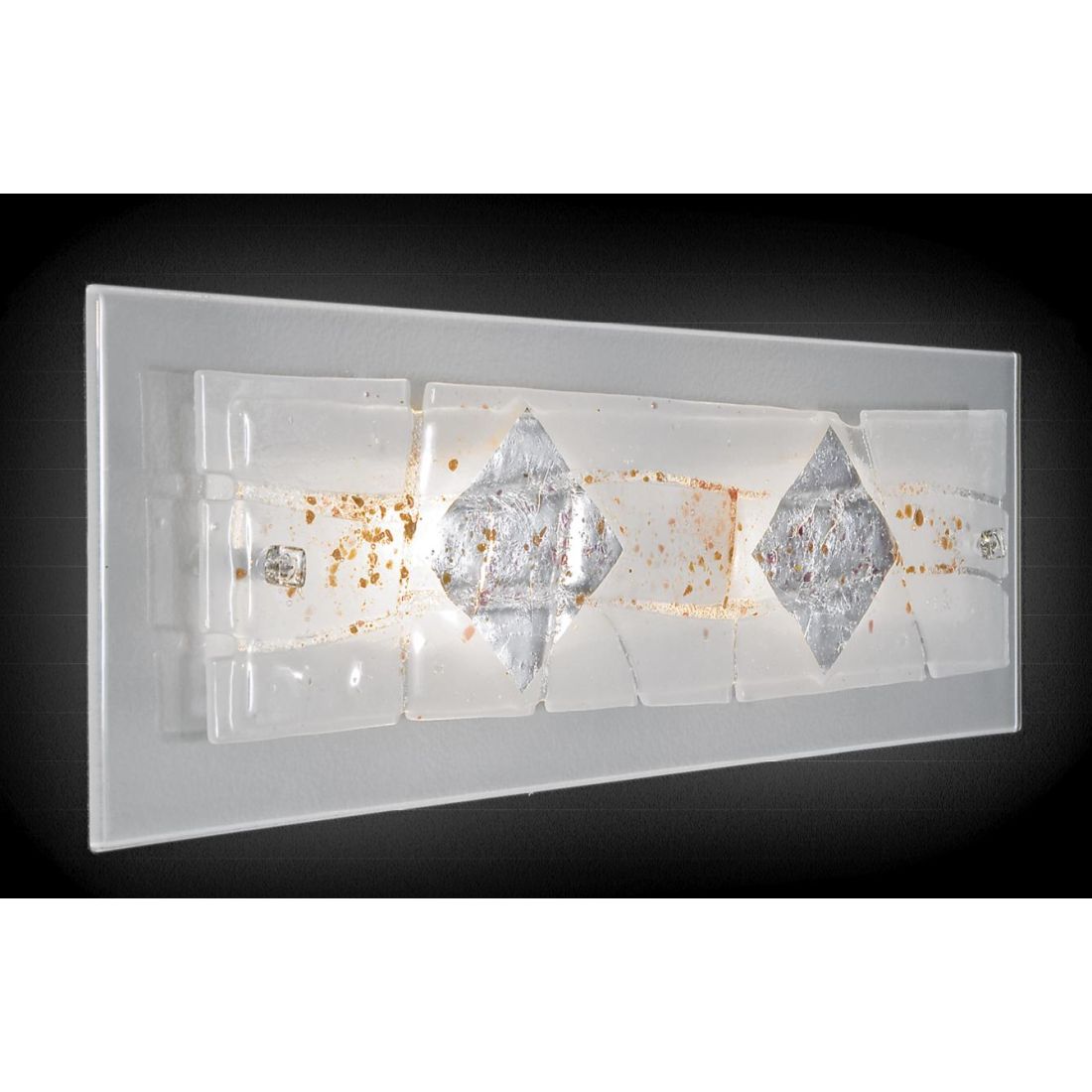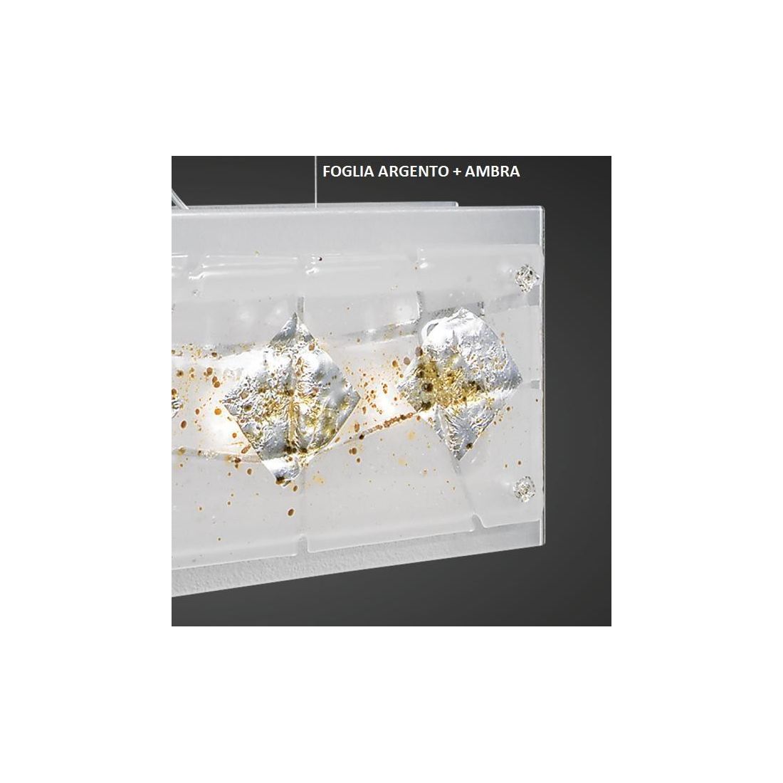 Lampada da parete con design moderno/contemporaneo, composta da una base in metallo e dal diffusore con vetro inferiore satinato e vetro anteriore con una decorazione in Foglia Argento o in Foglia Oro abbinato a particolari colorati; viene realizzata, infatto, artigianalmente attraverso la fusione di speciali graniglie colorate abbinate ai decori in Foglia che creano un gioco di colori davvero inimitabile.