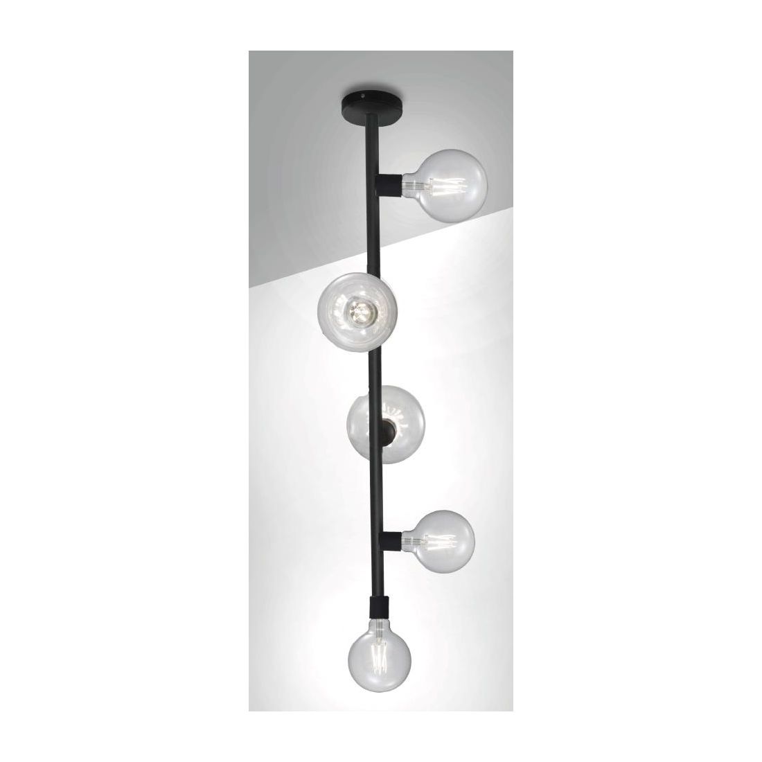 Plafoniera dal design moderno ed originale realizzata con una struttura lineare realizzata in metallo verniciato di Nero con 5 portalampade con attacco E27 dove potete inserire qualsiasi lampadina Led nel colore e nella potenza che più desiderate in base alle proprie esigenze.