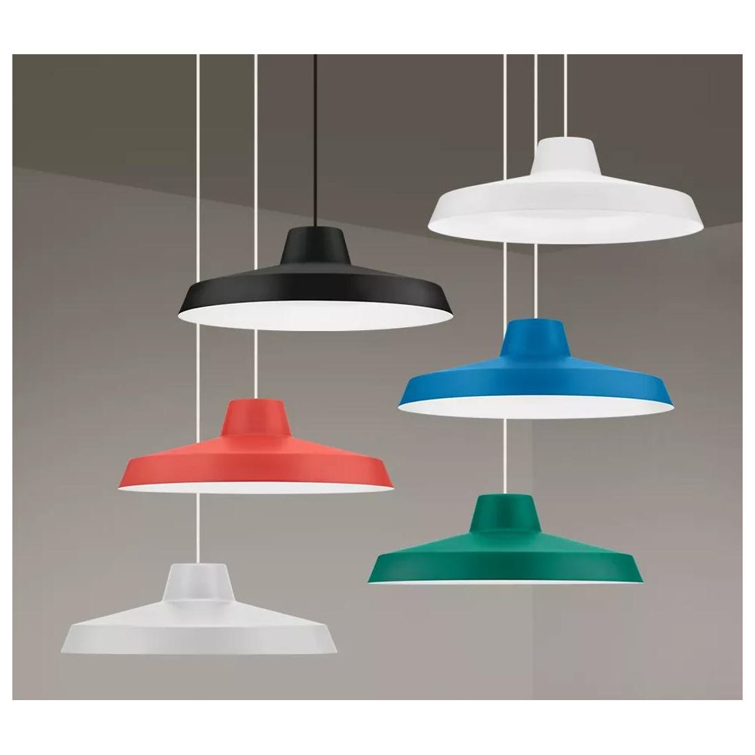 Lampadario a sospensione dallo stile vintage realizzato in metallo verniciato nei colori Bianco, Nero, Grigio, Blu, Verde e Rosso (a vostra scelta). L'interno del diffusore è sempre verniciato di bianco, garantendo una riflessione ottimale della luce e, a completare il design, trovate il cavo di sostegno e i rosoni bianchi ad eccezione della versione nera che si accompagna a cavo e rosone total-black.