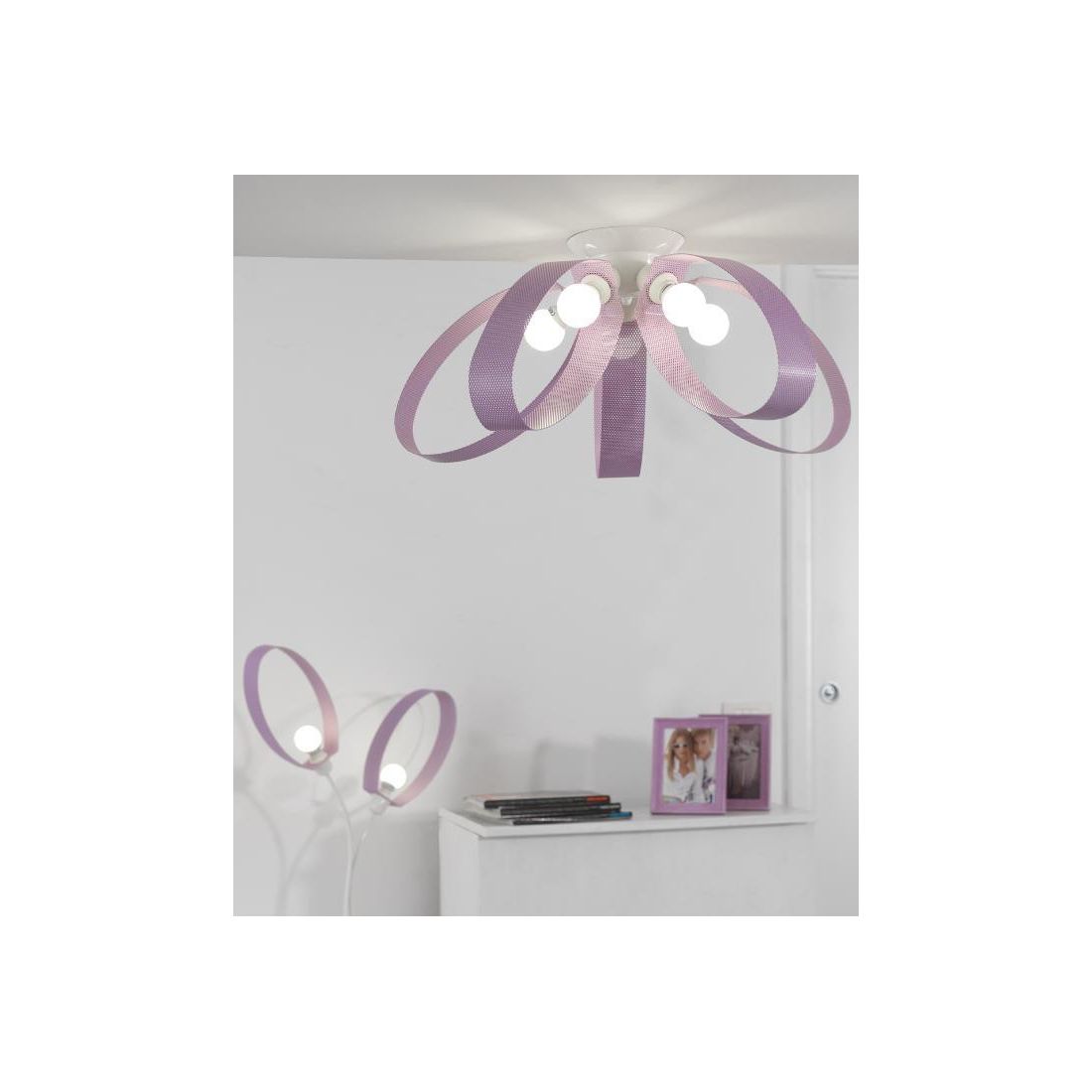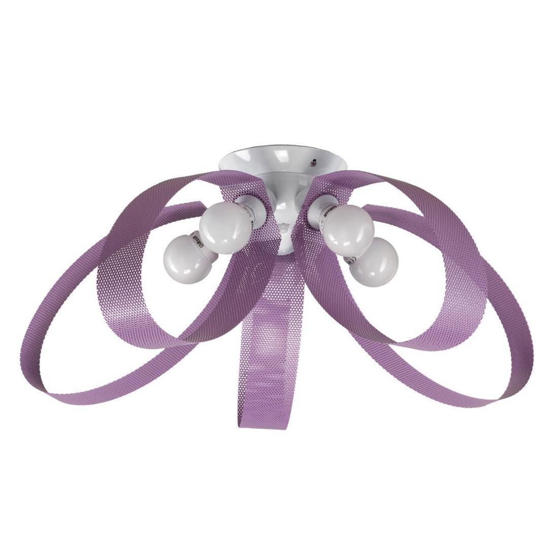 Plafoniera con un design moderno e giovanile che si presenta con un rosone a soffitto realizzato in metallo verniciato nel colore Bianco e con 5 paralumi, di forma ovali, totalmente aperti, realizzati in texture traforata colore Lilla; perfetta per dare un tocco di freschezza e di leggerezza ai vostri interni.