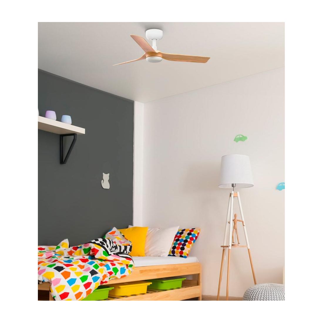 Il ventilatore Mini Punt S ha un design moderno ed è un prodotto che si presenta con la struttura in metallo con finitura Nera oppure Bianca (a vostra scelta) e con 3 pale realizzate in ABS che hanno finitura legno oppure in tinta con la montatura; con il suo diametro di cm 90 risulta ideale per ambienti con superfici fino a 13 m2 come saloni, cucine, camere da letto e uffici; è un prodotto adatto anche a soffitti inclinati.