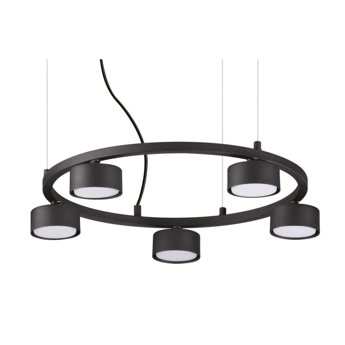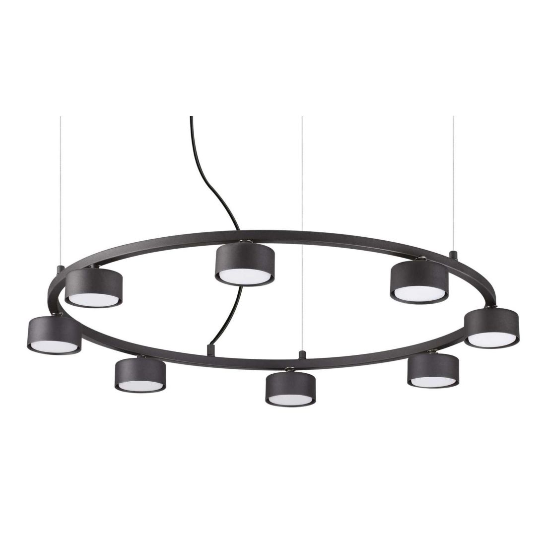 Lampadario a sospensione con un design ultra moderno che si presenta con un piccolo rosone a soffitto e con una struttura, di forma circolare aperta, il tutto realizzato in metallo verniciato a polveri nel colore Nero con 5 oppure 8 piccoli diffusori rotondi ancorati al cerchio ( vostra scelta) che emettono una luce prevalentemente rivolta verso il basso.