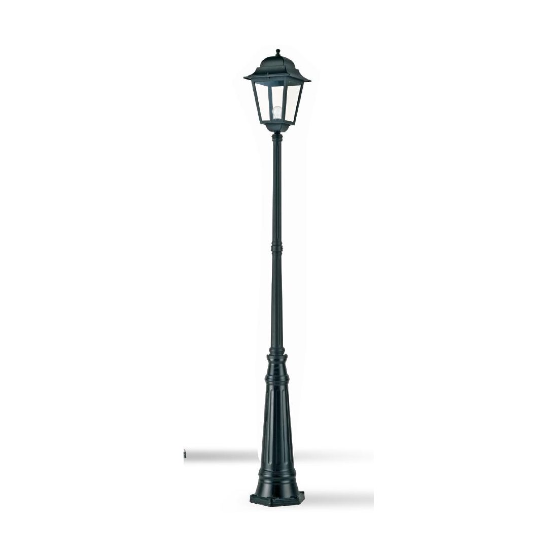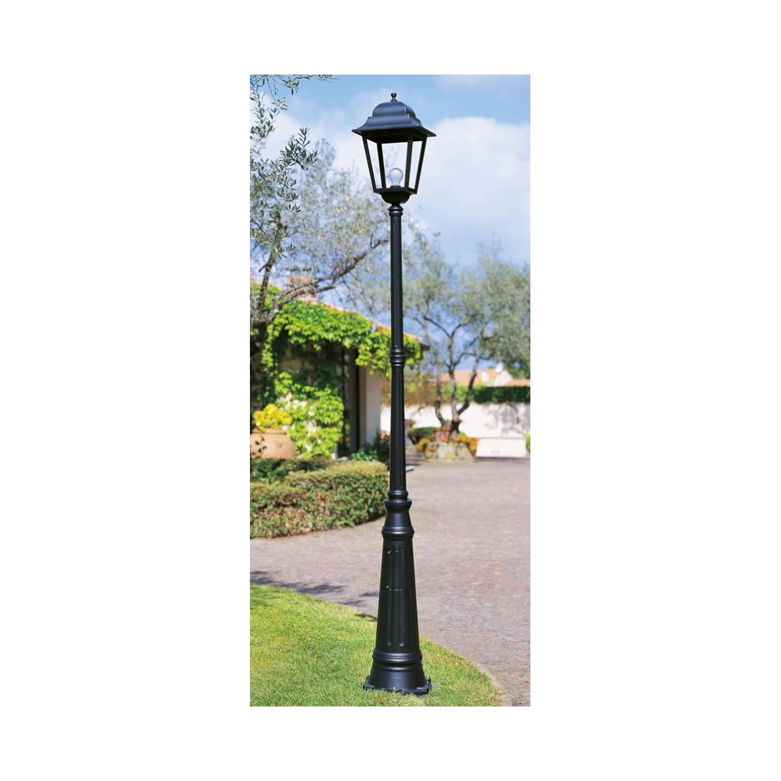 Lampione alto classico per esterni, con una struttura realizzata in alluminio pressofuso verniciato a polveri nel colore Nero e con diffusore in vetro trasparente; con dispositivo di connessione e triangolo di fissaggio a terra inclusi.