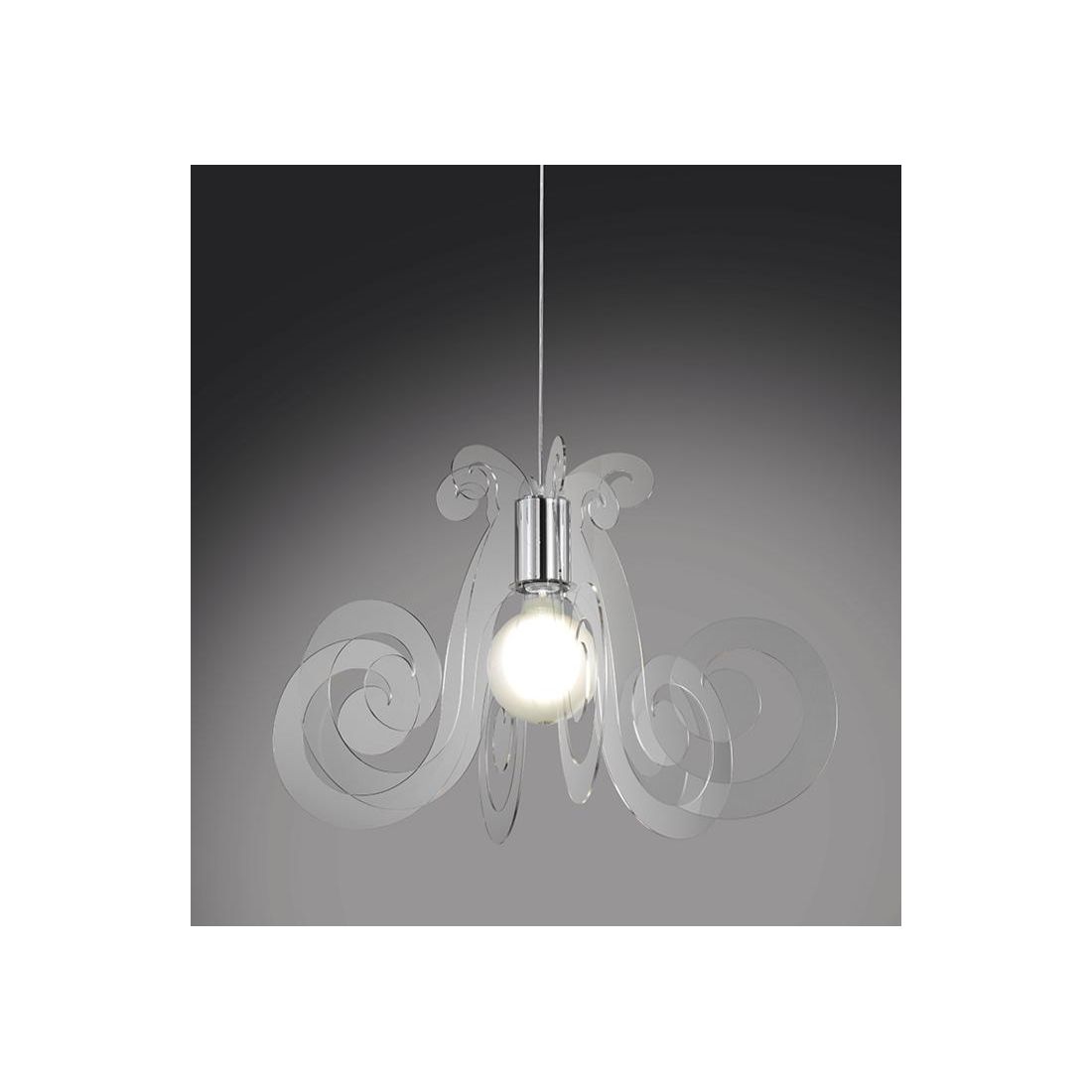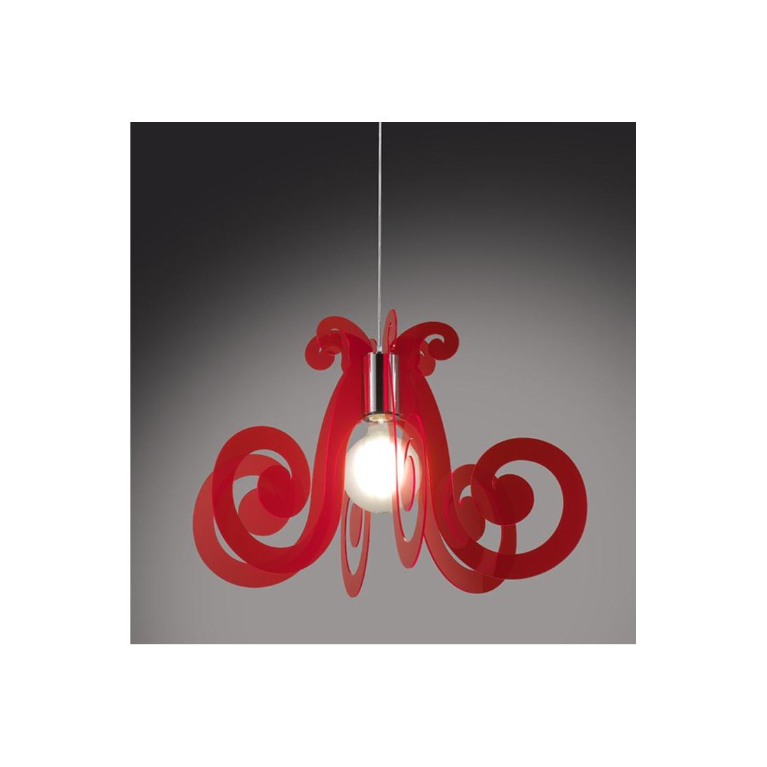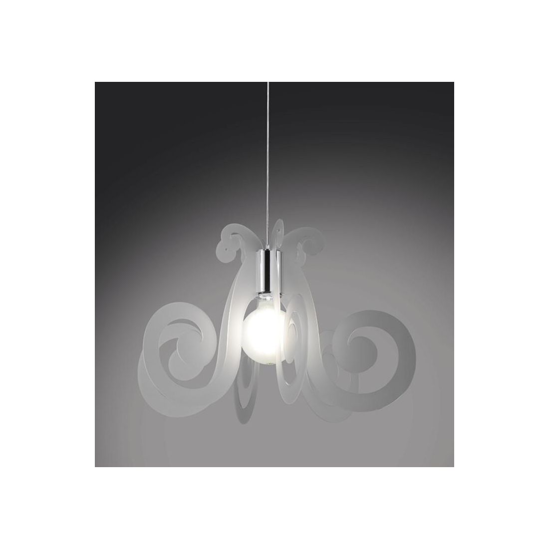 Lampadario a sospensione eclettico ed elegante che diventa un ottimo compromesso tra vintege e contemporaneo donando all'ambiente movimento e ricchezza; composto da particolari in metallo cromato e dal paralume composto da lastre arricciate in metacrilato disponibile in quattro diverse finiture: Bianco satinato - Fumè - Rosso - Trasparente.
