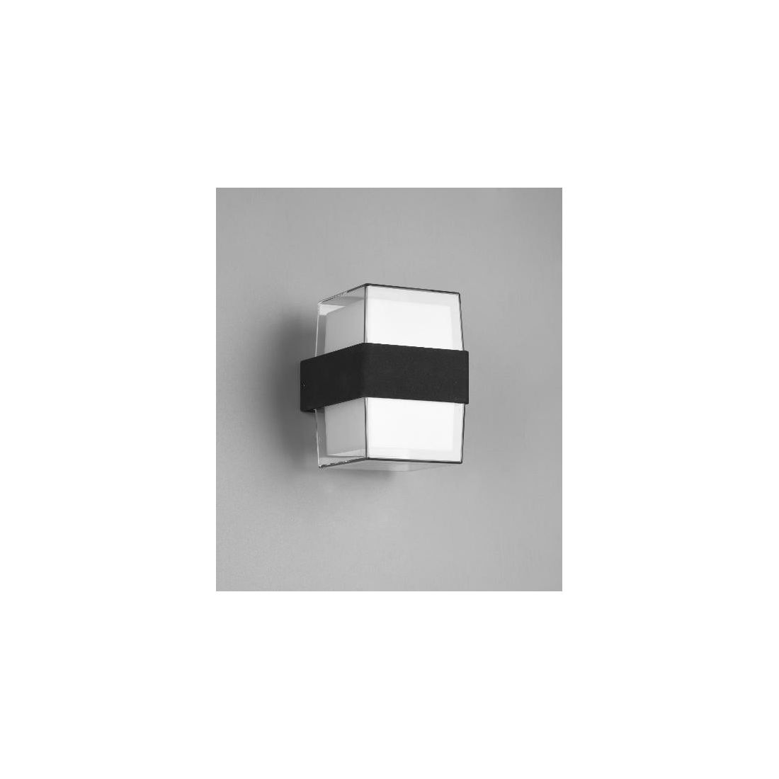 Applique da parete dallo stile moderna, con una forma rettangolare, con una base a fascia realizzata in alluminio pressofuso finitura Antracite e con un dissufore in materiale plastico, con copertura trasparente esterna e una copertura opaca interna, utile per un illuminazione diffusa di ambienti esterni come porticati, ingressi, gazebi, balconi e terrazzi.