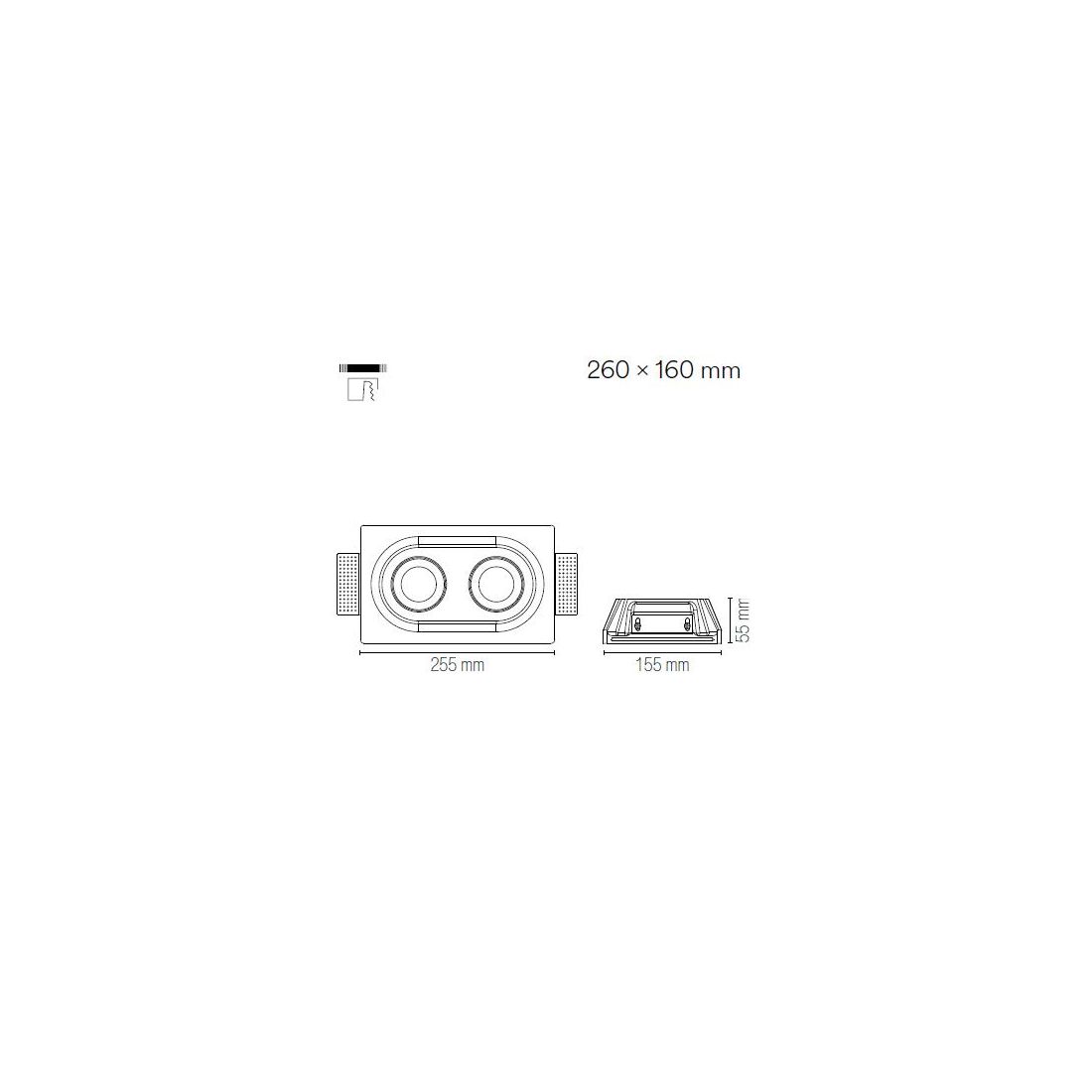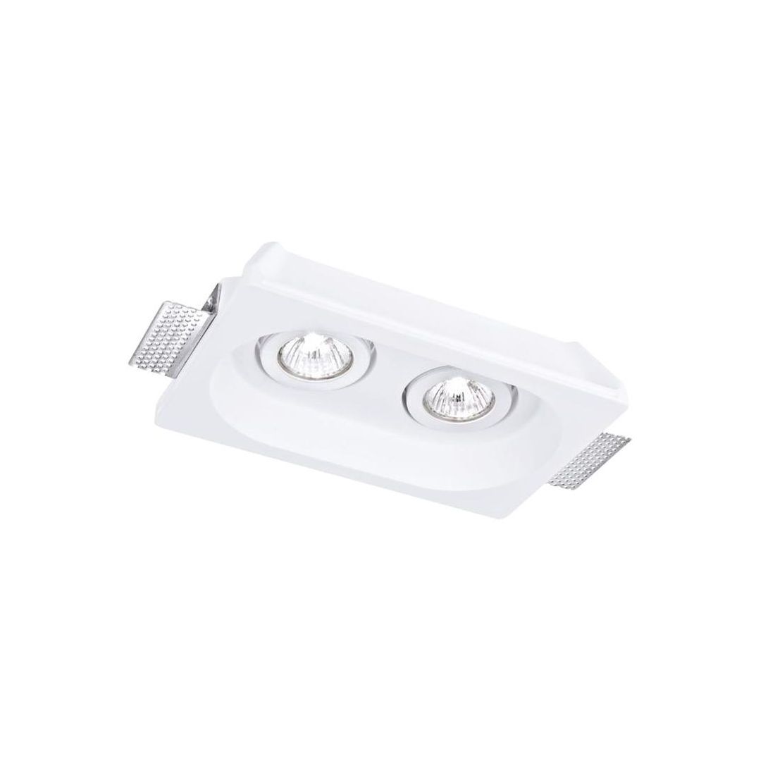 Faretto da incasso a 2 luci, perfetto per integrarsi armoniosamente in qualsiasi ambiente, che si presenta con una struttura rettangolare a scomparsa realizzata in gesso bianco verniciabile ideale per il montaggio in controsoffitti in cartongesso e può essere installato singolarmente, per un’illuminazione puntuale, oppure in configurazioni multiple per creare suggestivi giochi di luce.