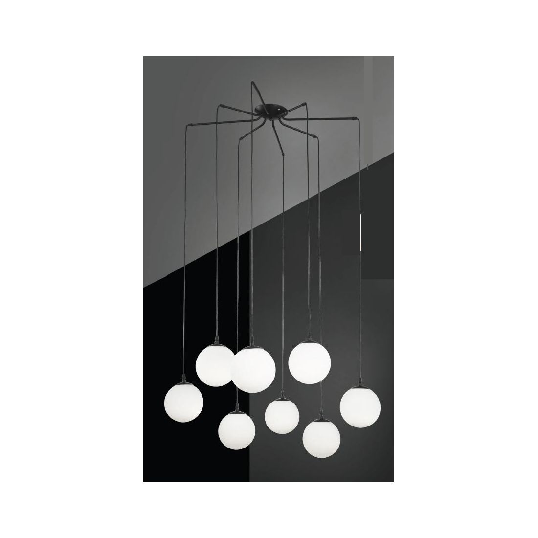 NIAGARA LAMPADARIO 12 LUCI IN METALLO NERO CON SFERE IN VETRO BIANCO OPALE MODERNO...